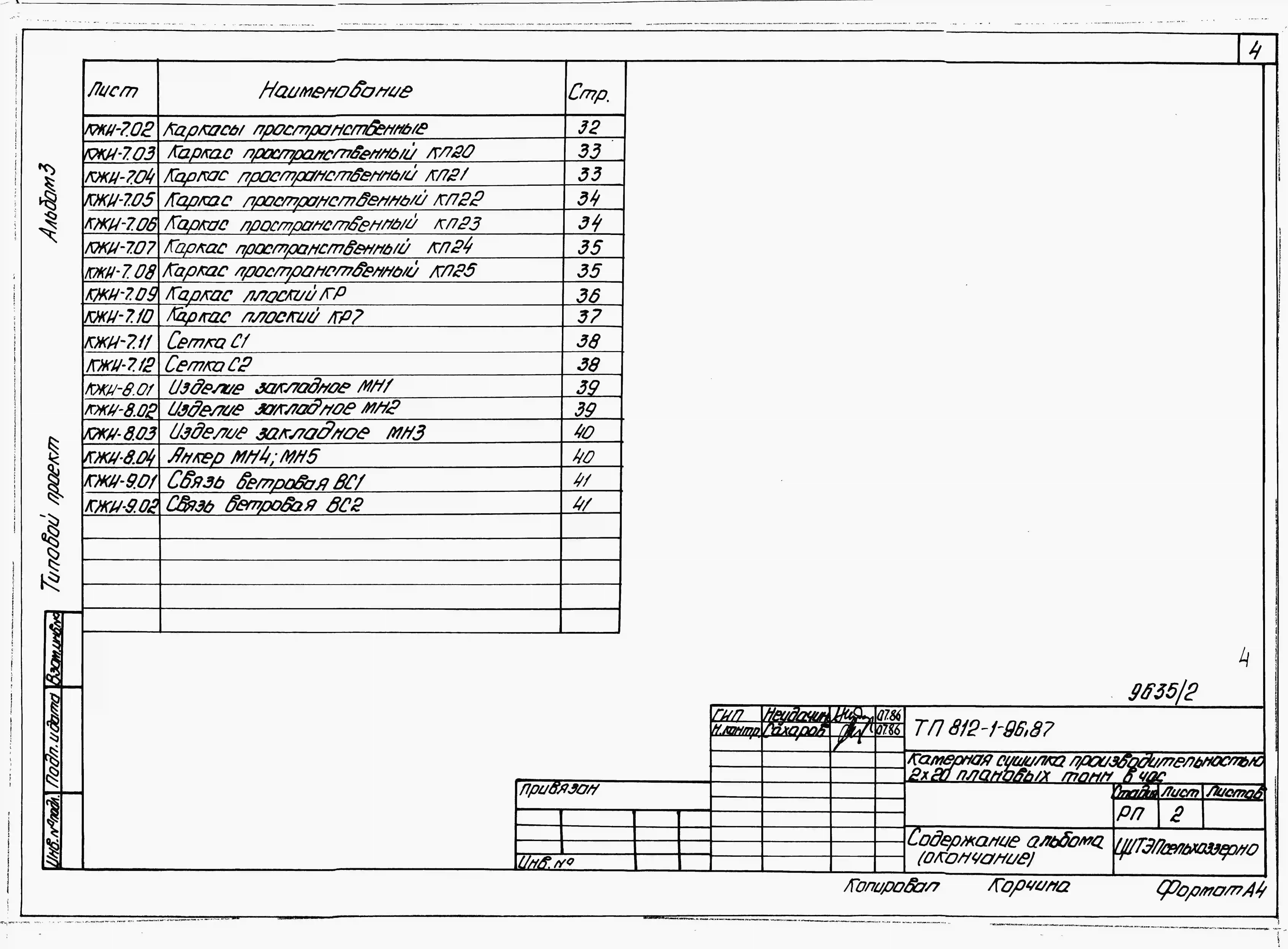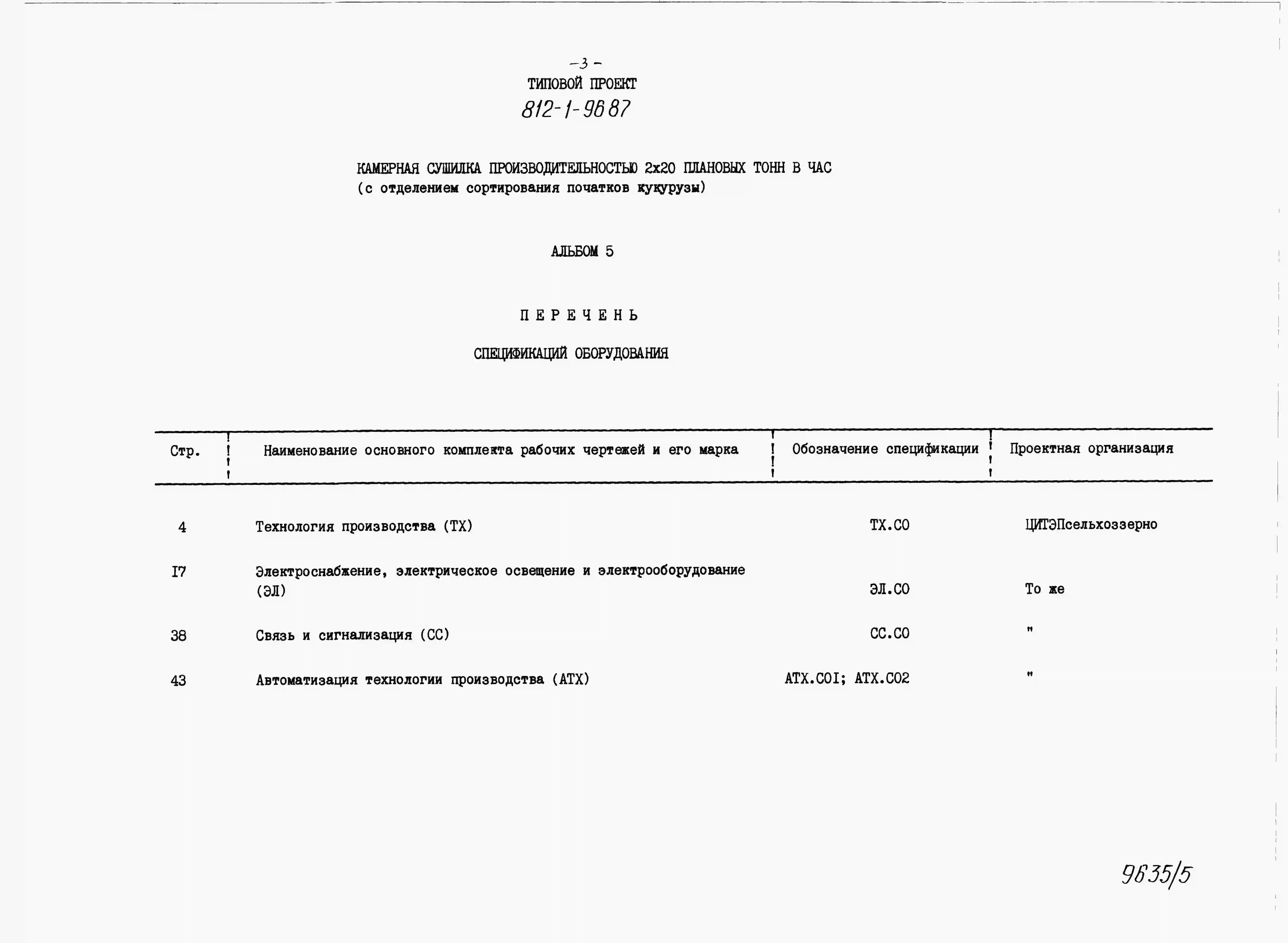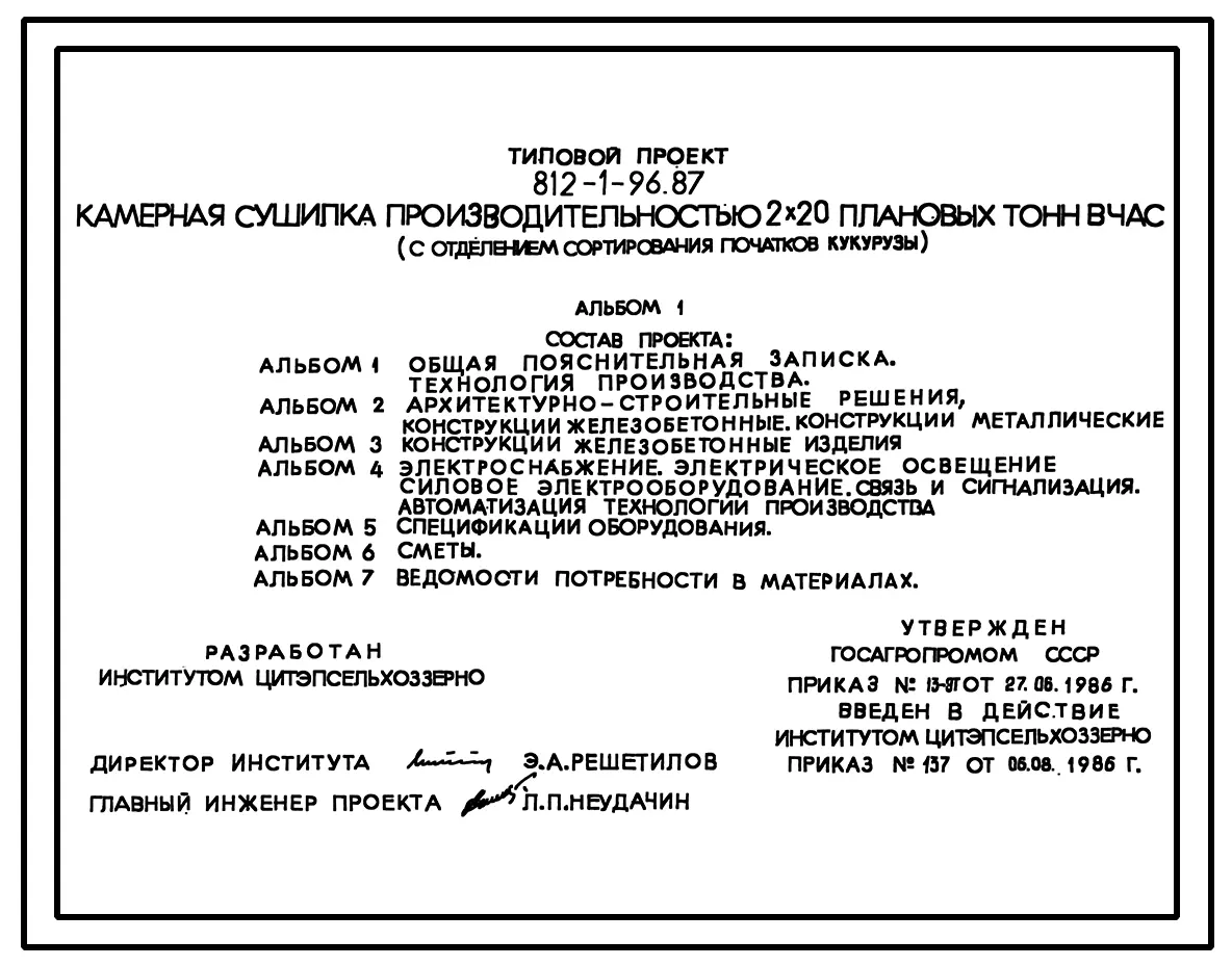 Типовой проект 812-1-96.87 Камерная сушилка производительностью 2х20 плановых т/ч (с отделением сортирования початков кукурузы)