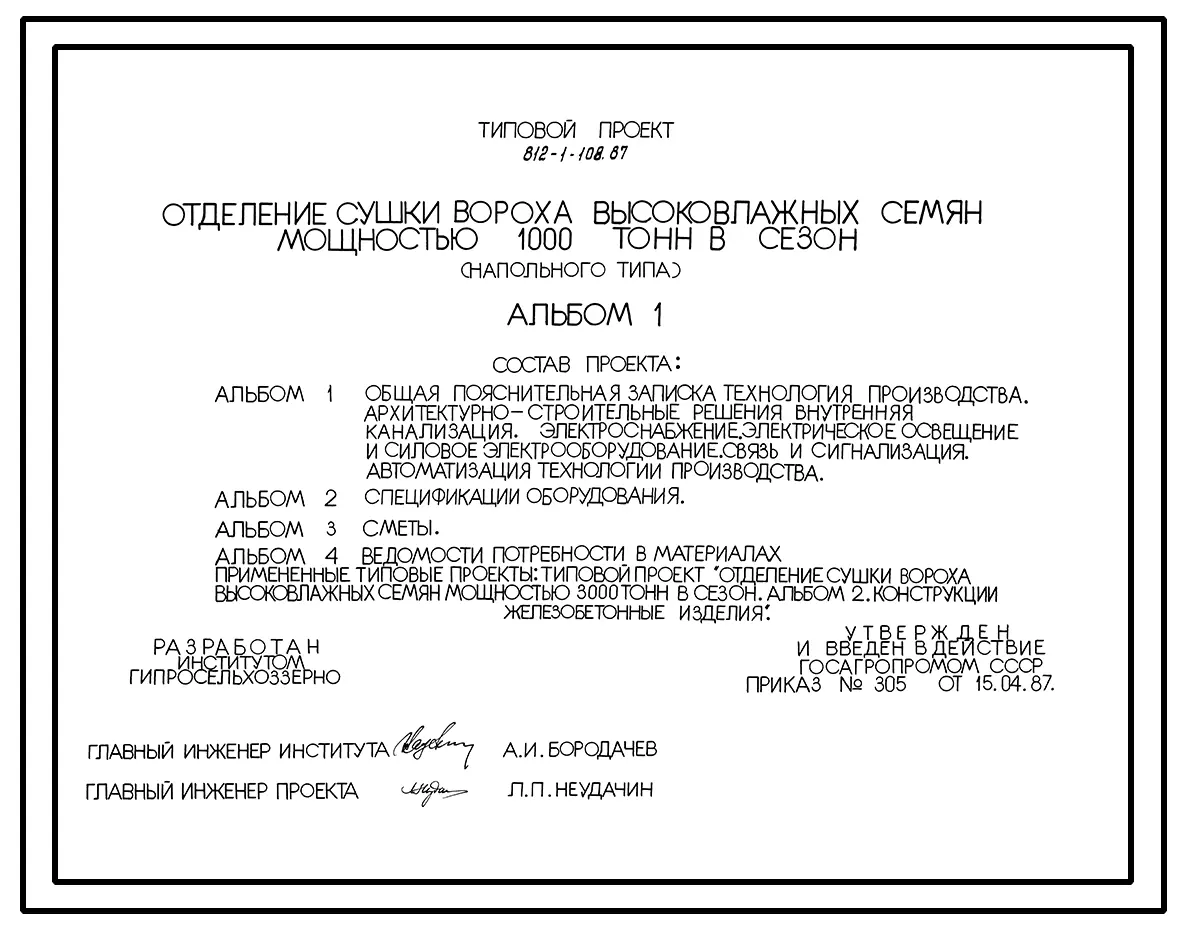 Типовой проект 812-1-108.87 Отделение сушки вороха высоковлажных семян мощностью 1000 т в сезон (напольного типа)