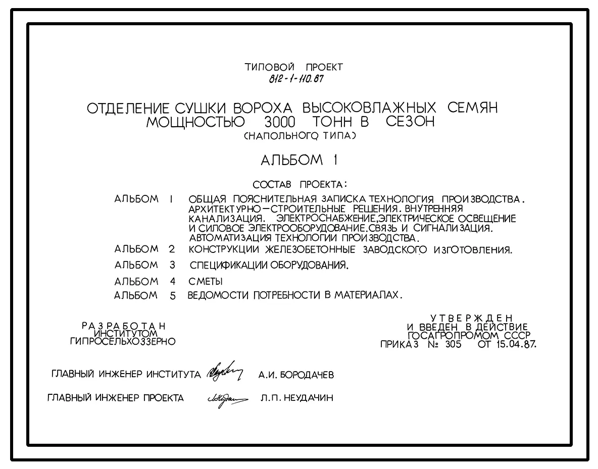 Типовой проект 812-1-110.87 Отделение сушки вороха высоковлажных семян мощностью 3000 т в сезон (напольного типа)