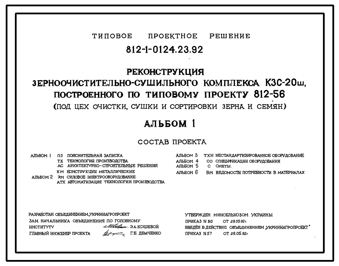 Типовой проект 812-1-0124.23.92 Реконструкция зерноочистительно-сушильного комплекса КЗС-20Ш, построенного по т.п. 812-56 (под цех очистки, сушки и сортировке зерна и семян)