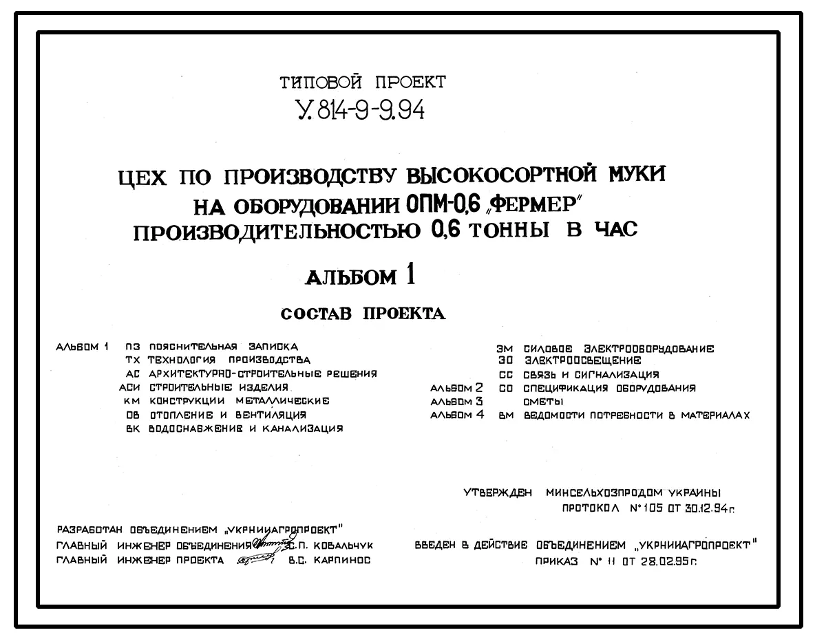 Типовой проект У.814-9-9.94 Цех по производству высокосортной муки на оборудовании ОПМ-0,6 «Фермер» производительностью 0,6 т в час
