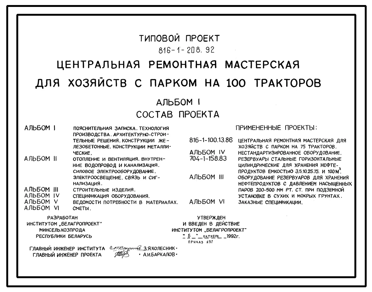 Типовой проект 816-1-208.92 Центральная ремонтная мастерская для хозяйств с парком на 100 тракторов