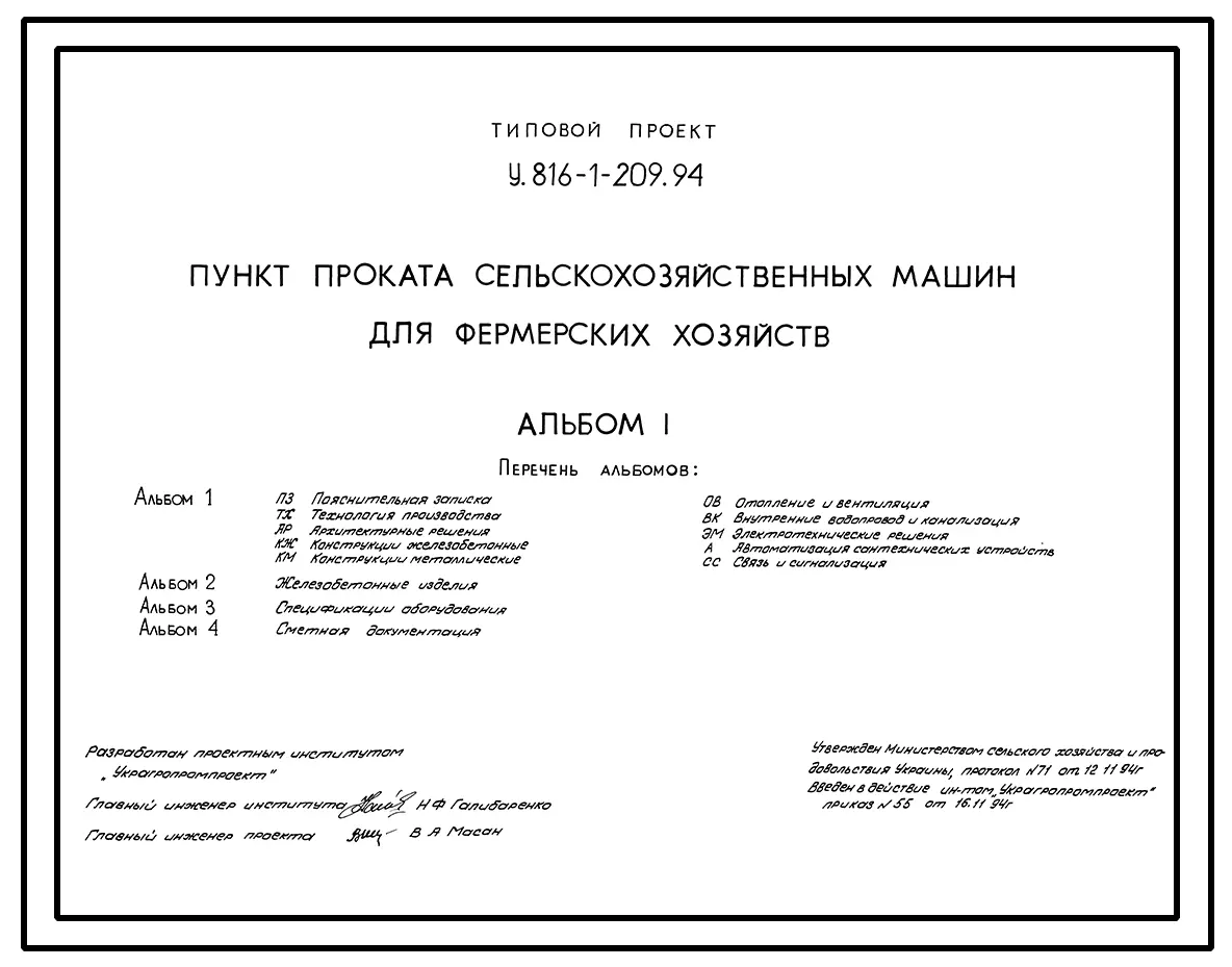 Типовой проект У.816-1-209.94 Пункт проката сельскохозяйственных машин для фермерских хозяйств
