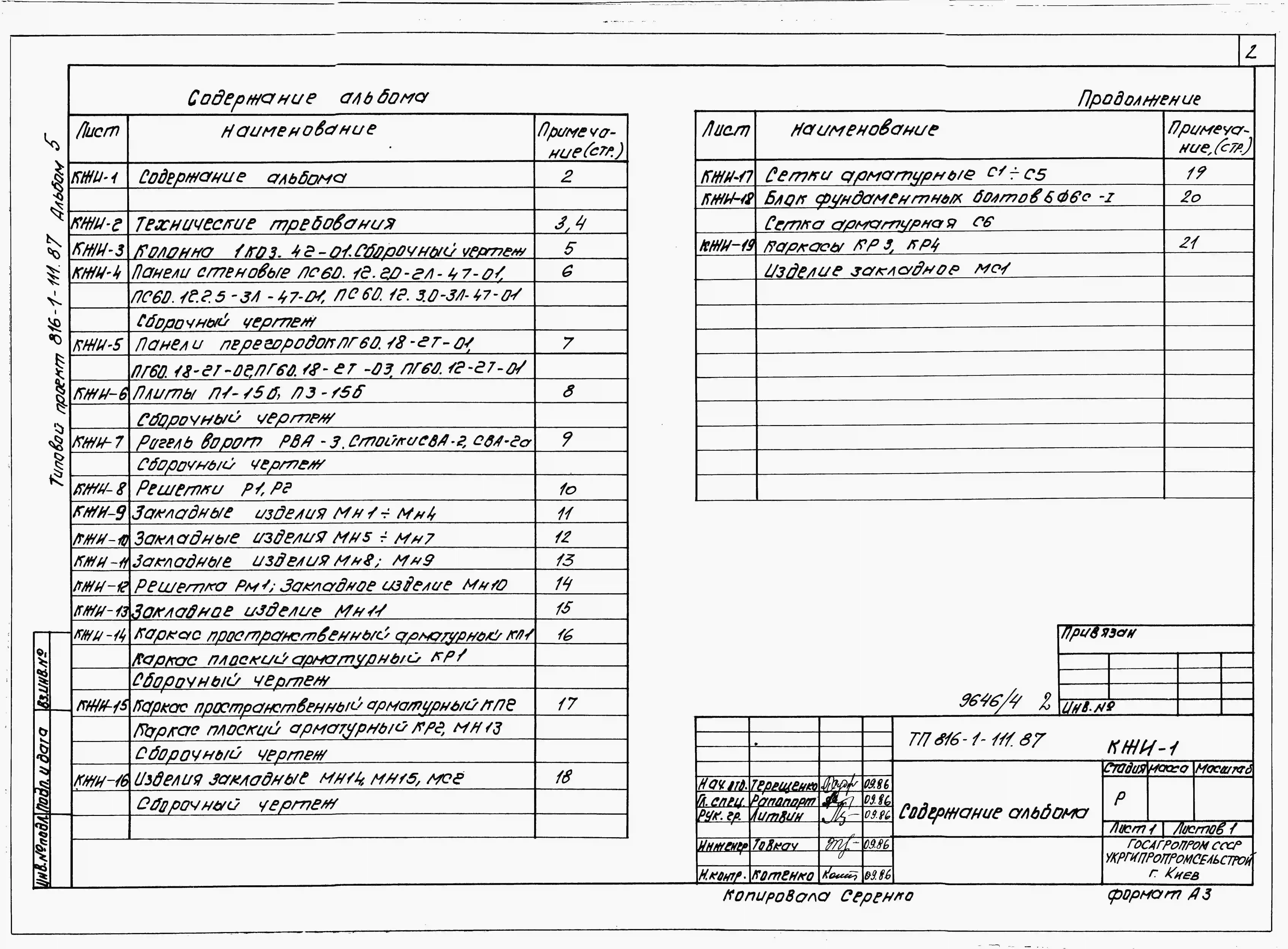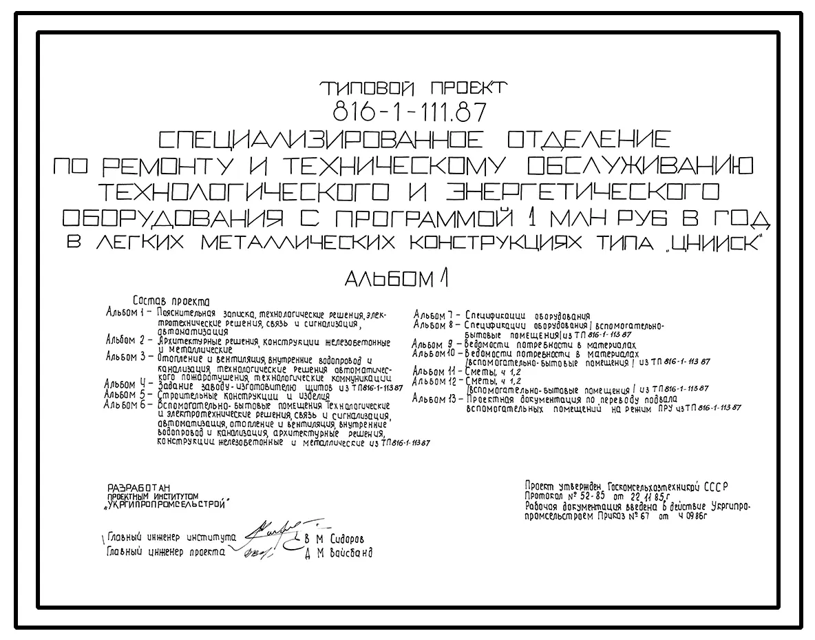 Типовой проект 816-1-111.87 Специализированное отделение по ремонту и техническому обслуживанию технологического и энерготехнического оборудования с программой 1 млн. руб. в год в легких металлических конструкциях типа «ЦНИИСК»