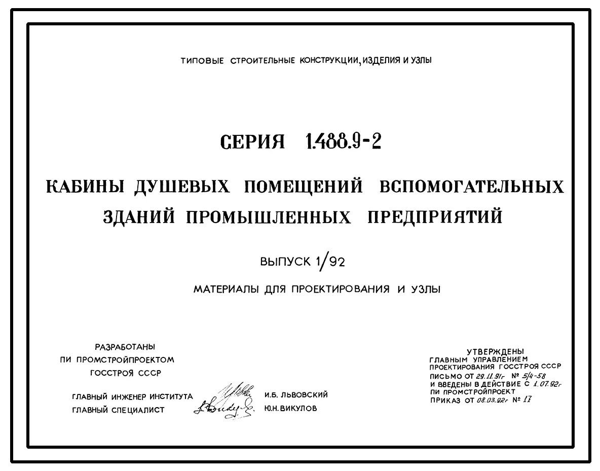 Серия 1.488.9-2 Кабины душевых помещений вспомогательных зданий промышленных предприятий. Материалы для проектирования и рабочие чертежи.