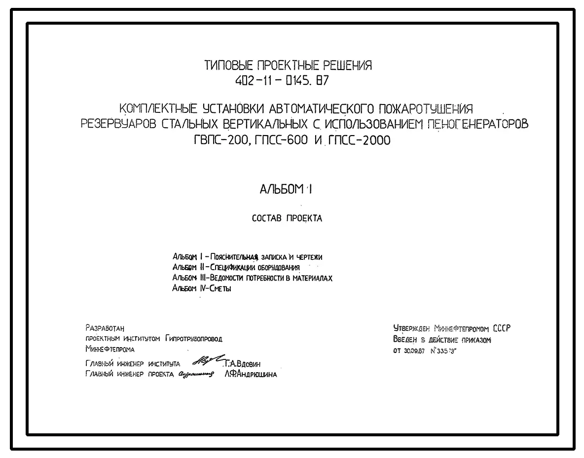 Типовой проект 402-11-0145.87 Комплектные установки автоматического пожаротушения резервуаров стальных вертикальных с использованием пеногенераторов ГВПС-200, ГПСС-600 и ГПСС-2000