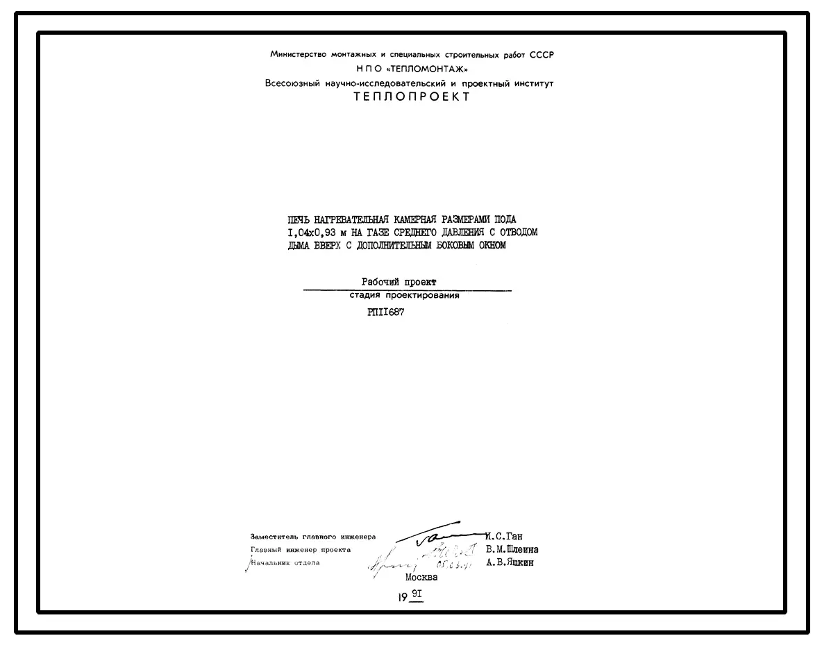 Проект 11687 Печь нагревательная камерная размерами пода 1.04х0.93 м на газе среднего давления с отводом дыма вверх с дополнительным боковым окном