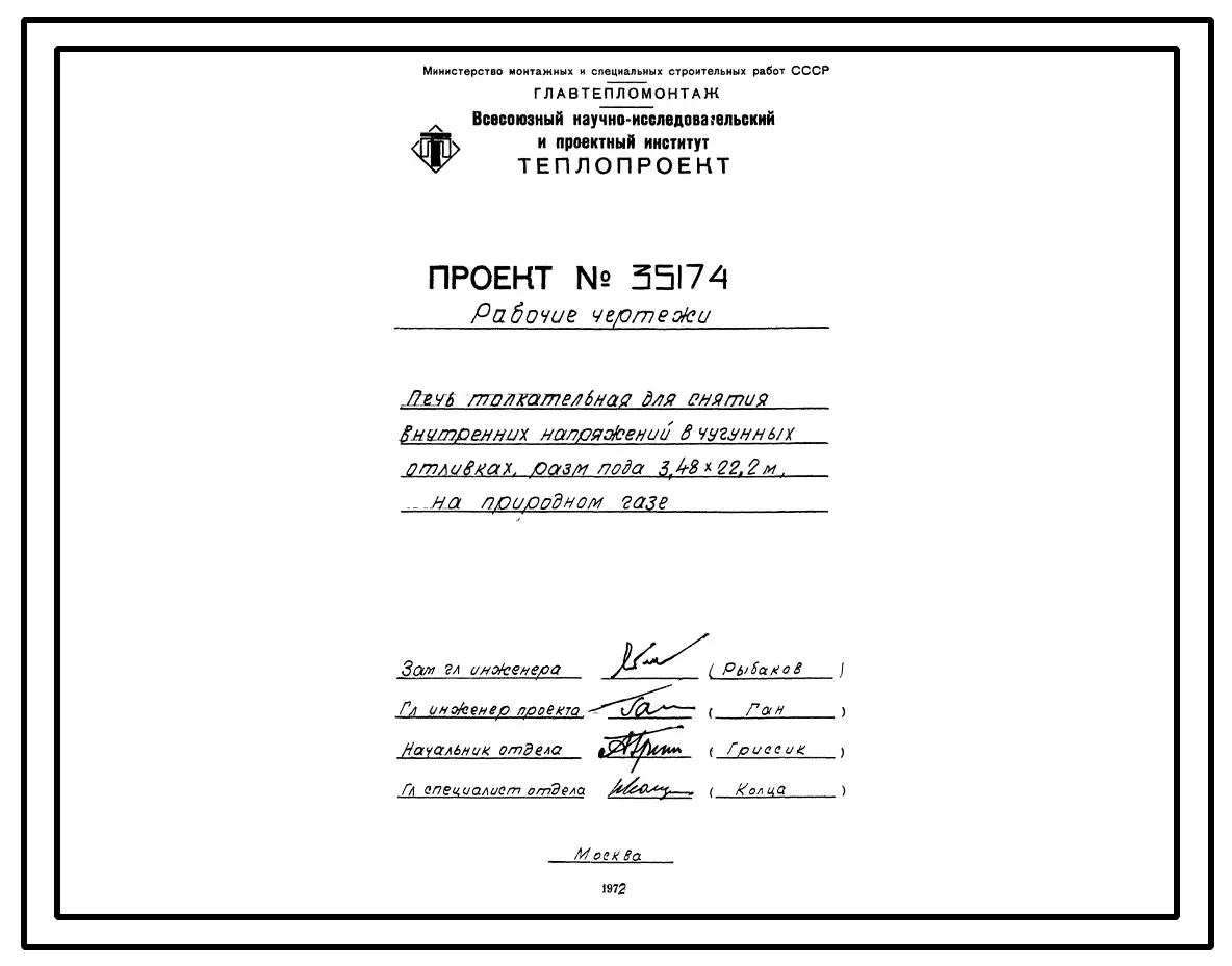 Проект 35174 Печь толкательная для снятия внутренних напряжений в чугунных отливках размерами пода 3,48х22,2 м на природном газе