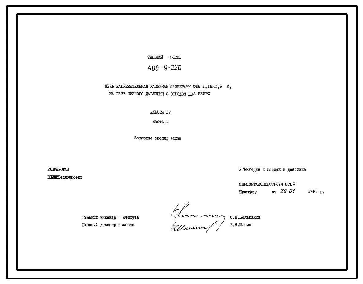 Типовой проект 406-9-220 Печь нагревательная камерная размерами пода 1,16 х 1,5 м на газе низкого давления с отводом дыма вверх