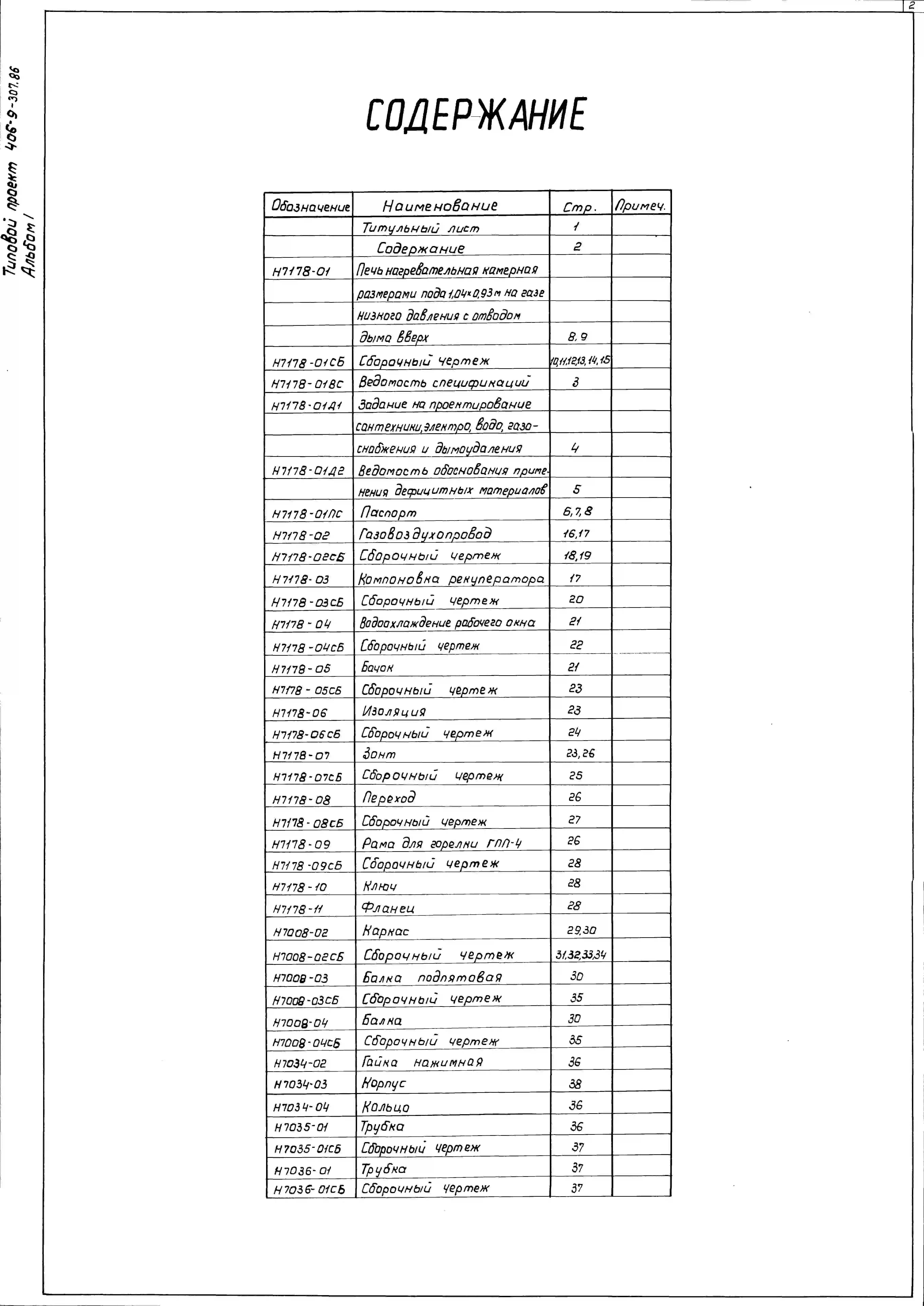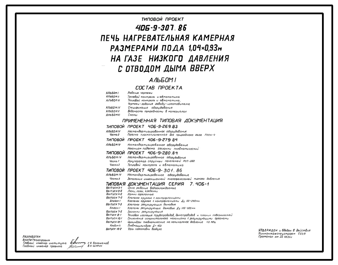 Типовой проект 406-9-307.86 Печь нагревательная камерная размерами пода 1,04 х 0,93 м на газе низкого давления с отводом дыма вверх