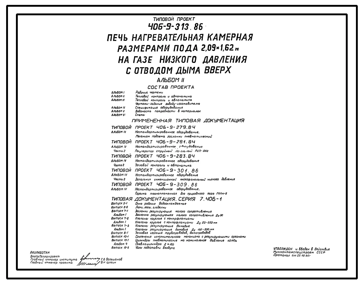 Типовой проект 406-9-313.86 Печь нагревательная камерная размерами пода 2,09 х 1,62 м на газе низкого давления с отводом дыма вверх