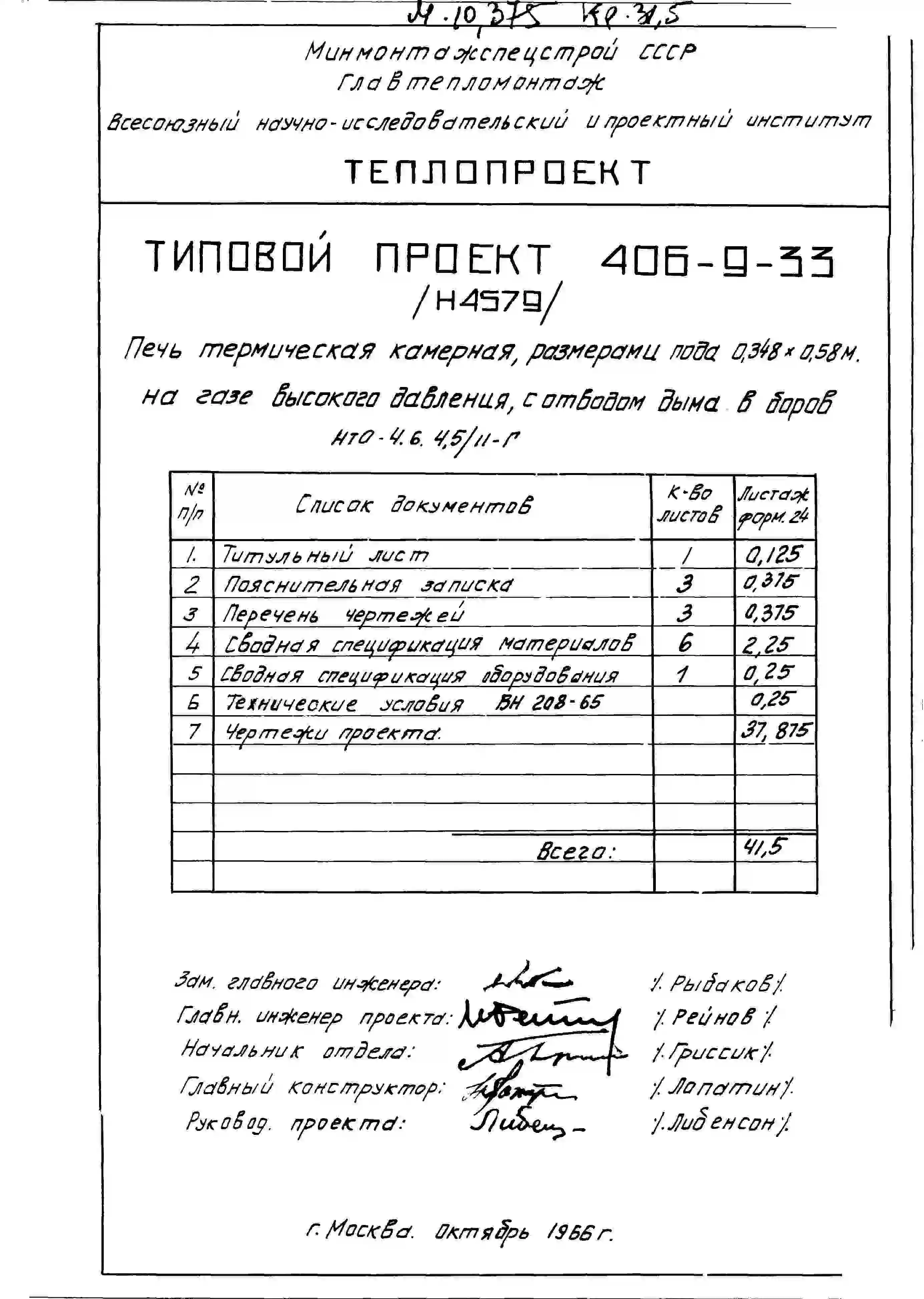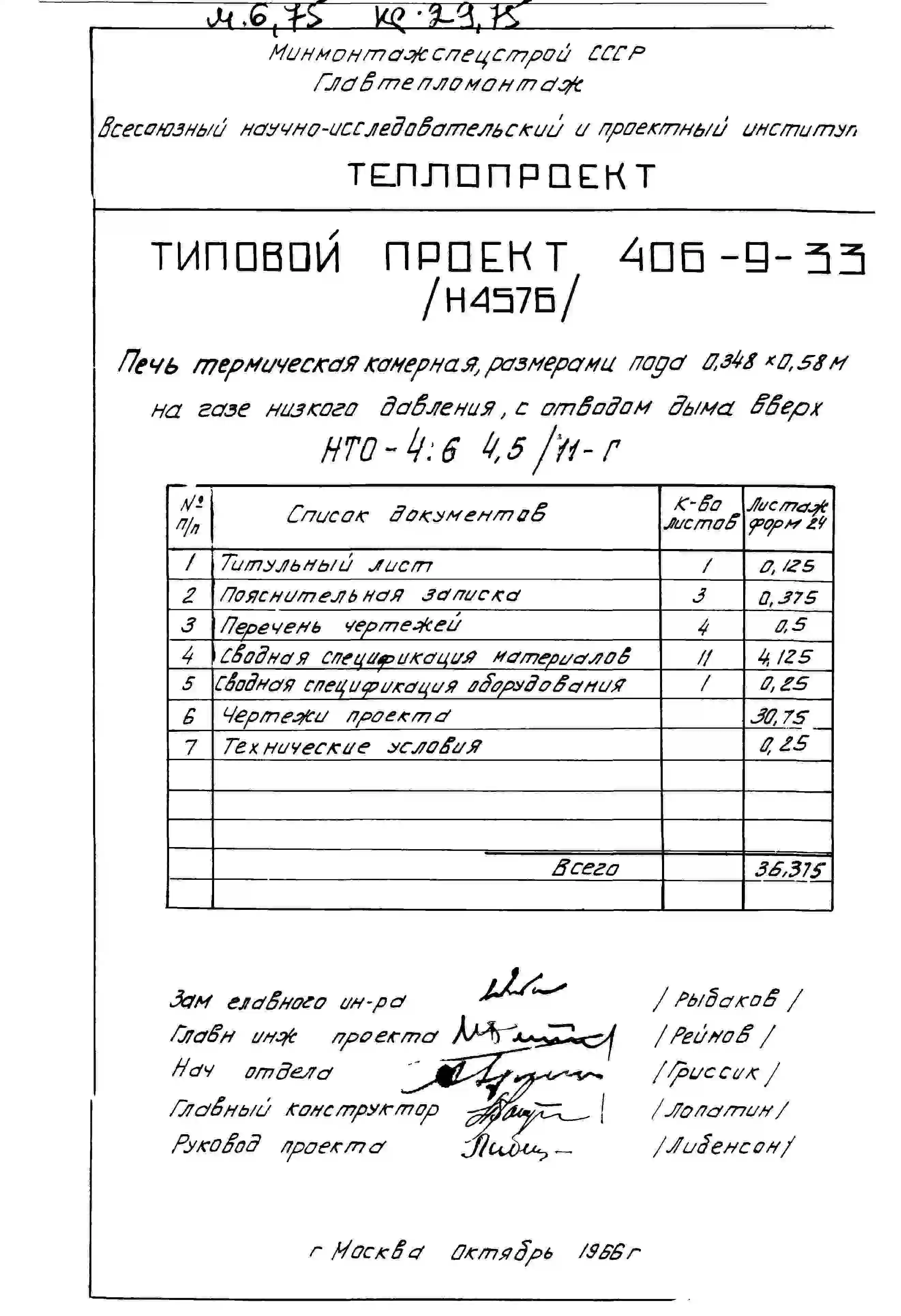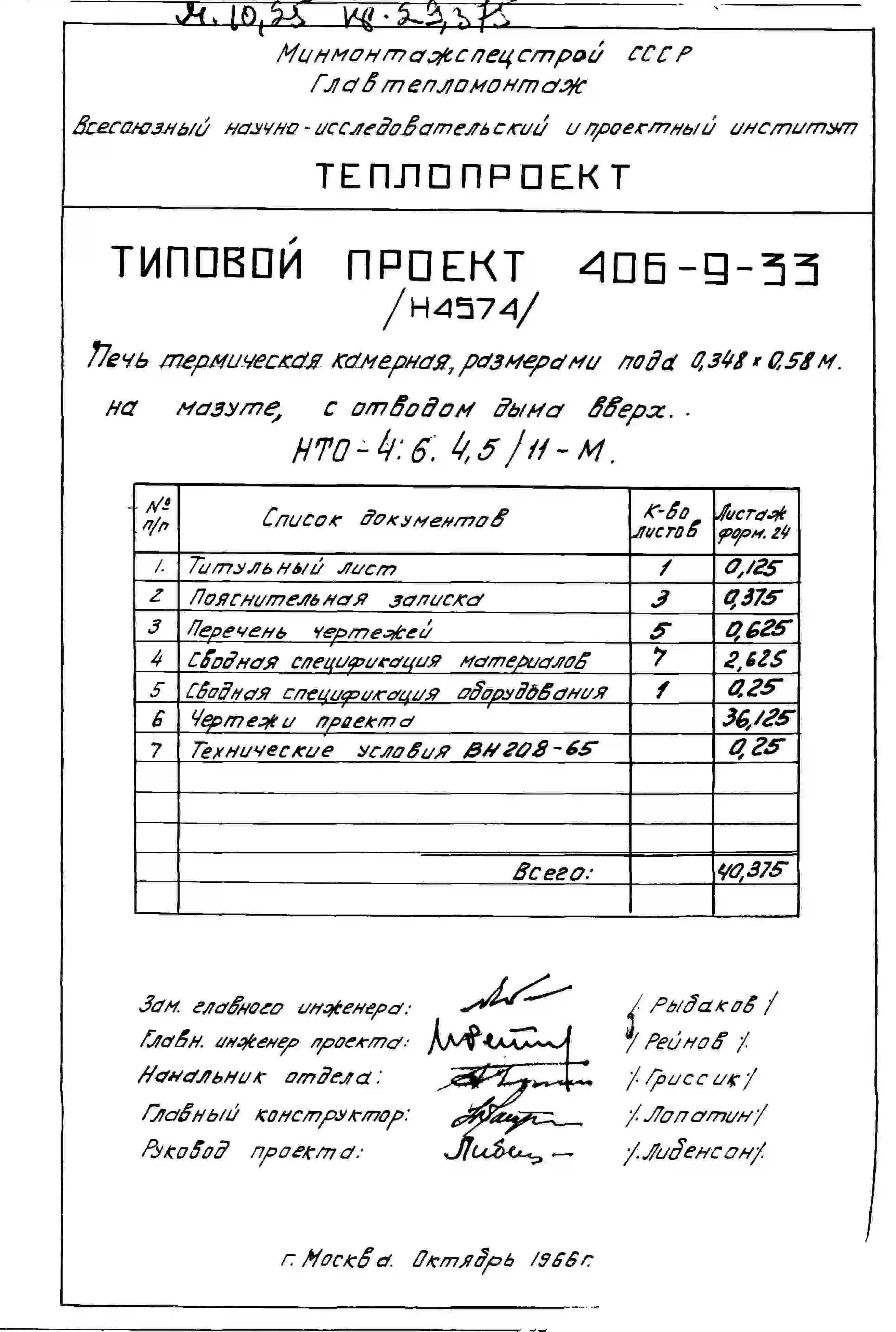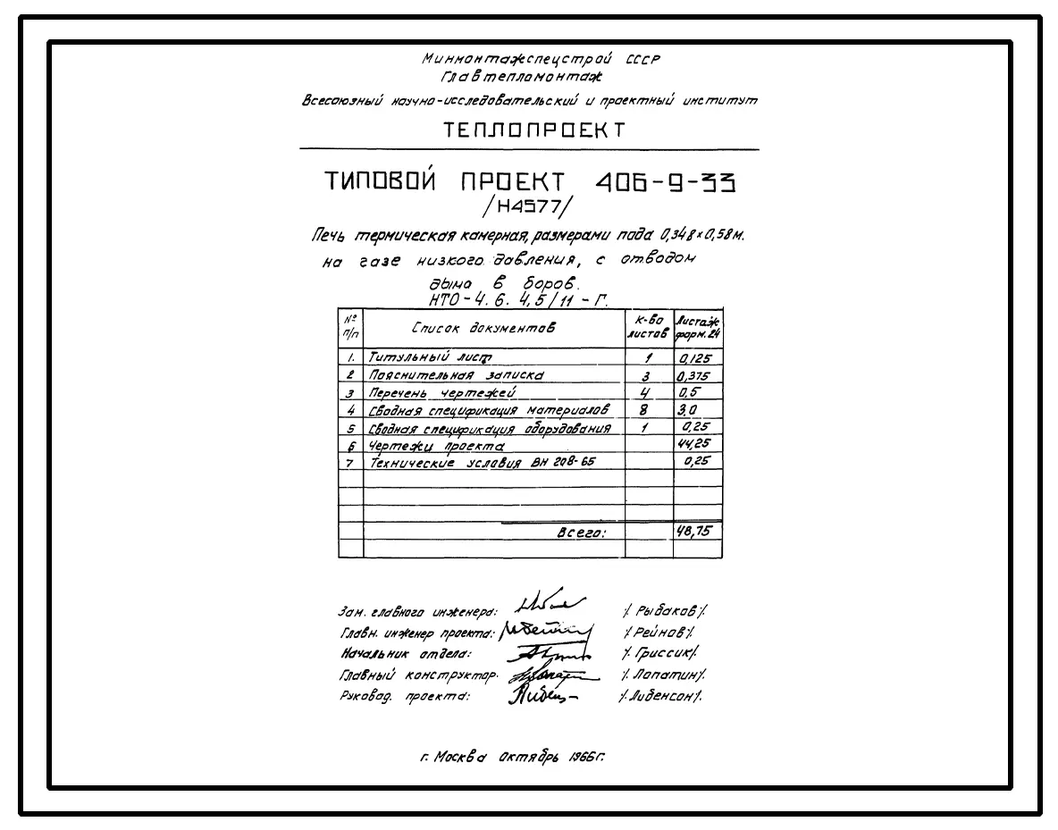 Типовой проект 406-9-33 Печи термические камерные размерами пода 0,348х0,58 м на мазуте и газе низкого и высокого давления с отводом дыма вверх и в боров