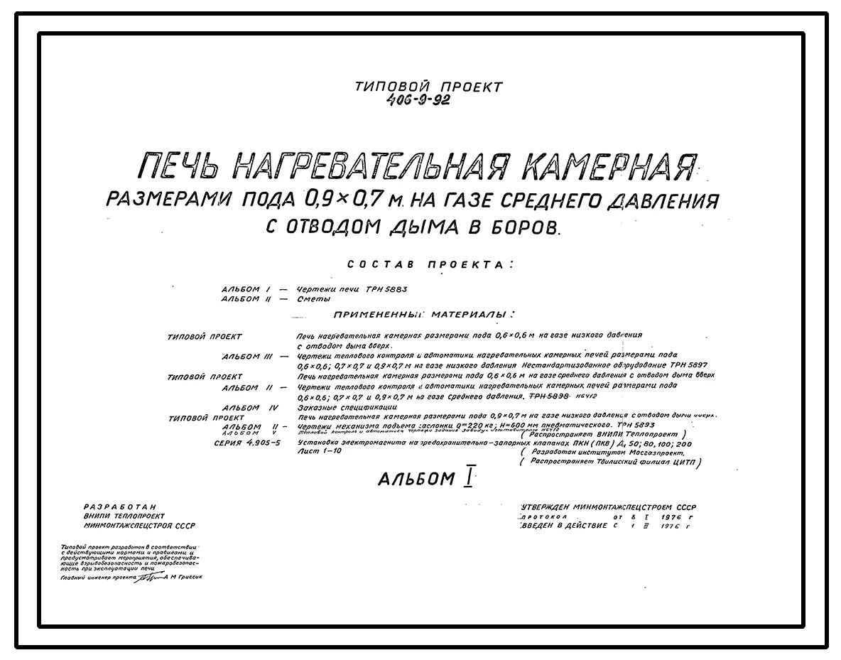 Типовой проект 406-9-92 Печь нагревательная камерная размерами пода 0,9х0,7 м на газе среднего давления с отводом дыма в боров.