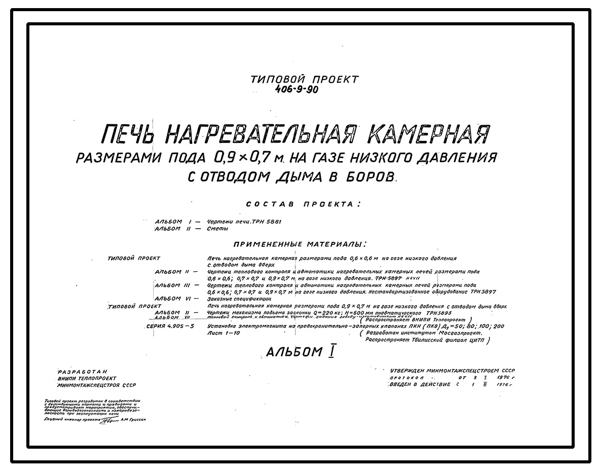 Типовой проект 406-9-90 Печь нагревательная камерная размерами пода 0,9х0,7 м на газе низкого давления с отводом дыма в боров.