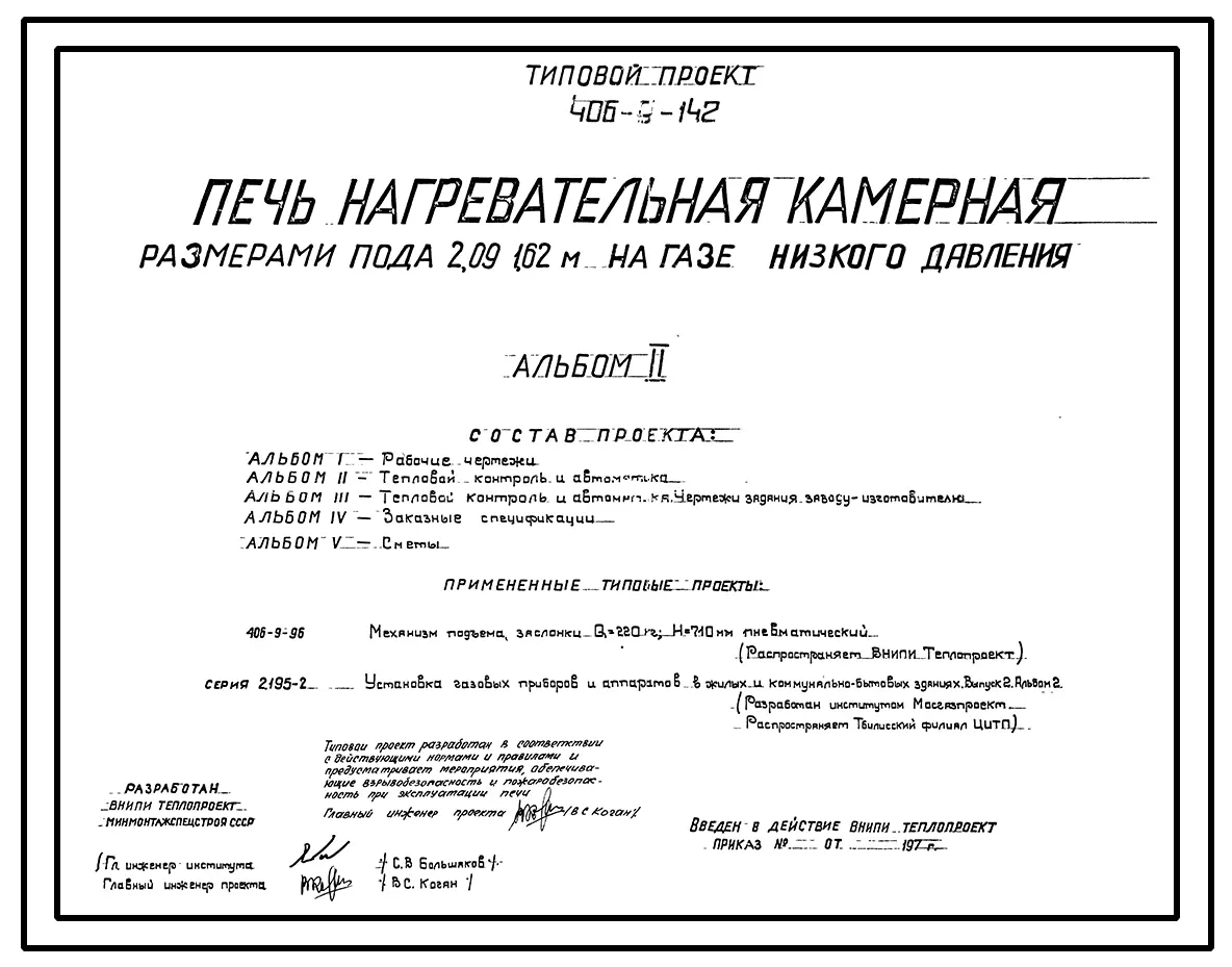 Типовой проект 406-9-142 Печь нагревательная камерная размерами пода 2,09х1,62 м на газе низкого давления с отводом дыма в боров.