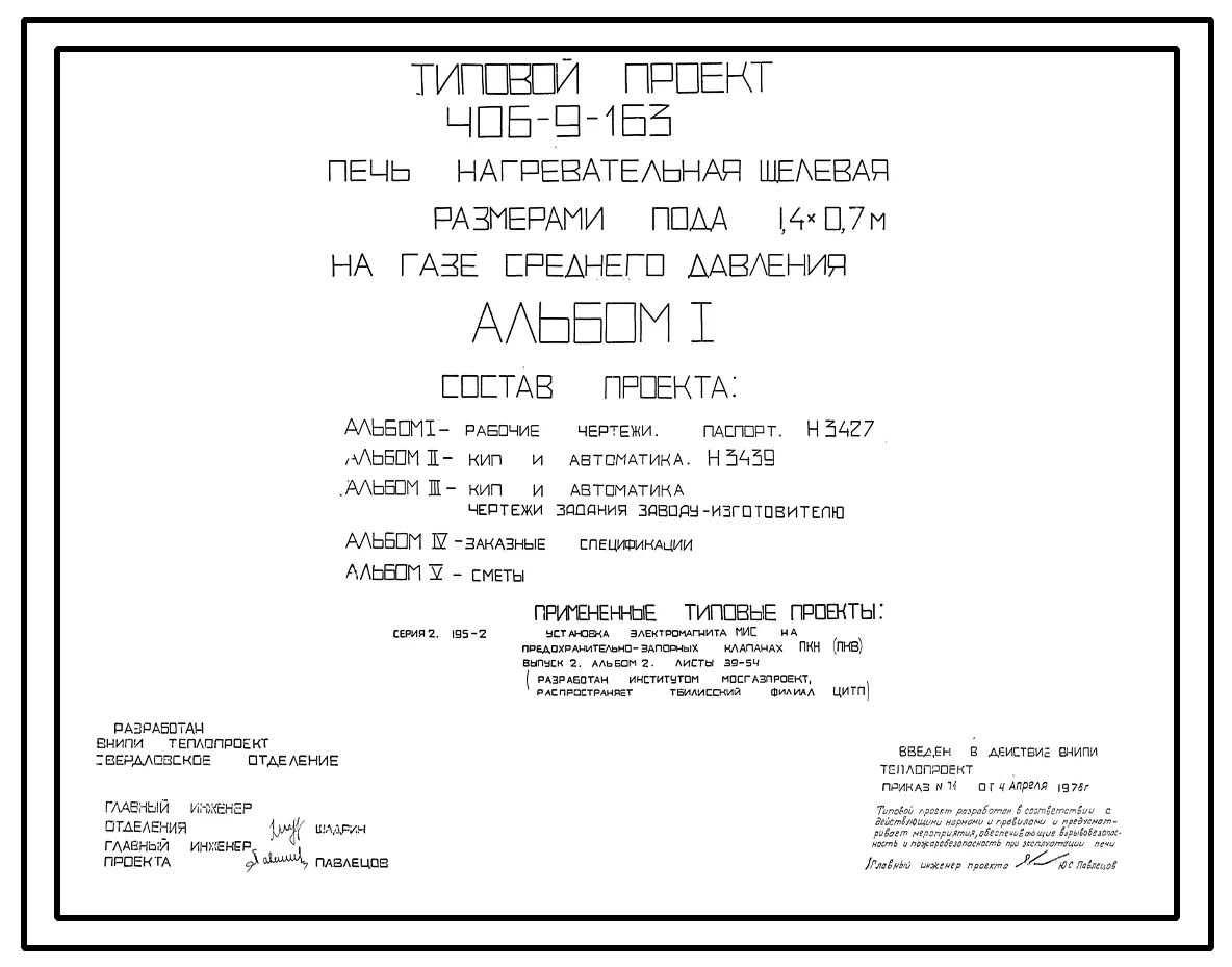 Типовой проект 406-9-163 Печь нагревательная щелевая размерами пода 1,4х0,7 м на газе среднего давления.