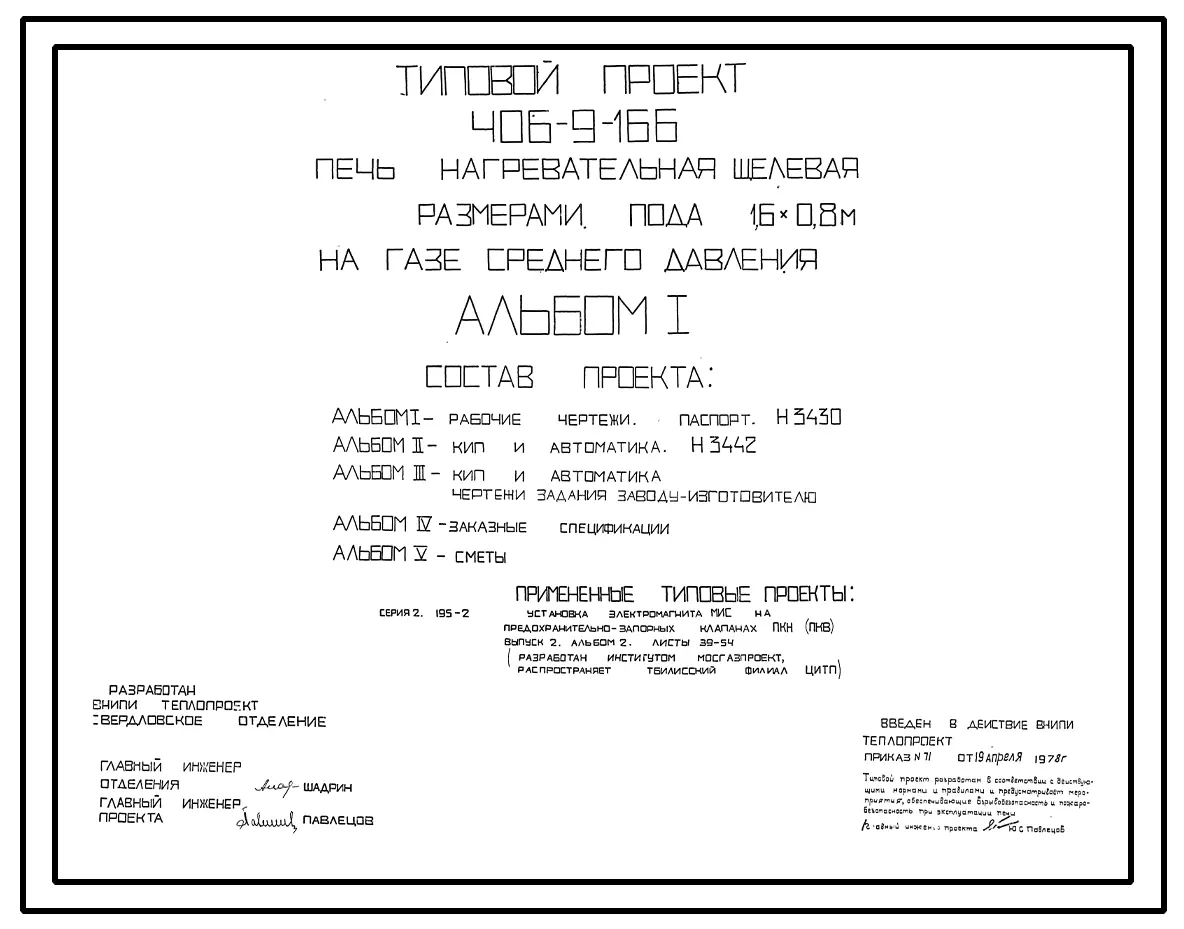 Типовой проект 406-9-166 Печь нагревательная щелевая размерами пода 1,6х0,8 м на газе среднего давления.