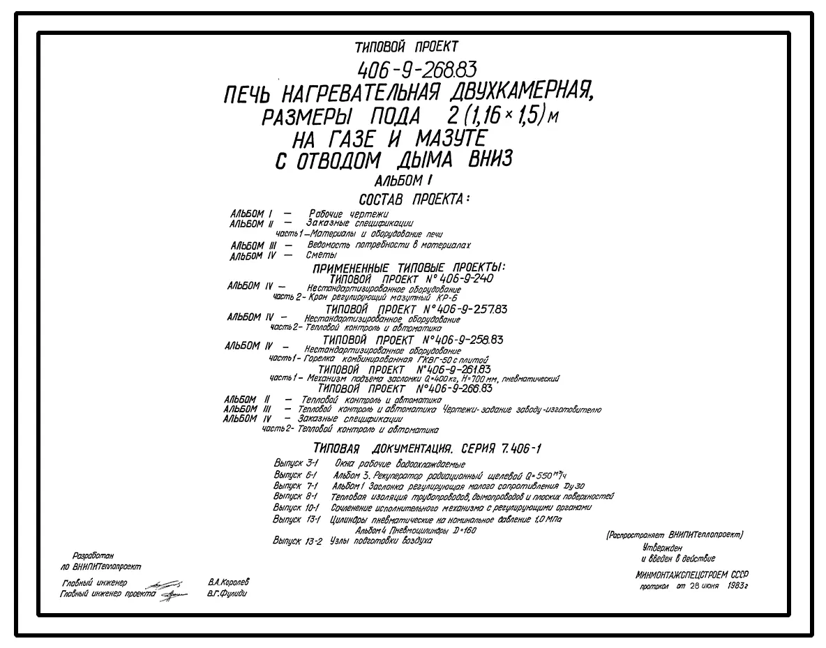 Типовой проект 406-9-268.83 Печь нагревательная двухкамерная, размеры пода 2(1,16х1,5)м, на газе и мазуте с отводом дыма вниз.