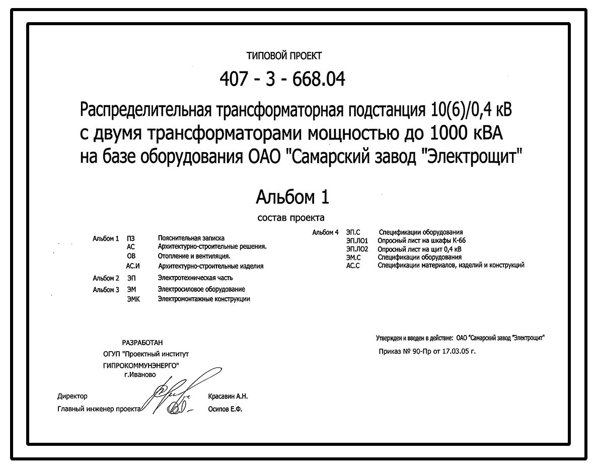 Типовой проект 407-3-668.04 Распределительная трансформаторная подстанция 10(6)/0,4 кВ с двумя трансформаторами мощностью до 1000 кВ?А на базе оборудования ОАО “Самарский завод “Электрощит””