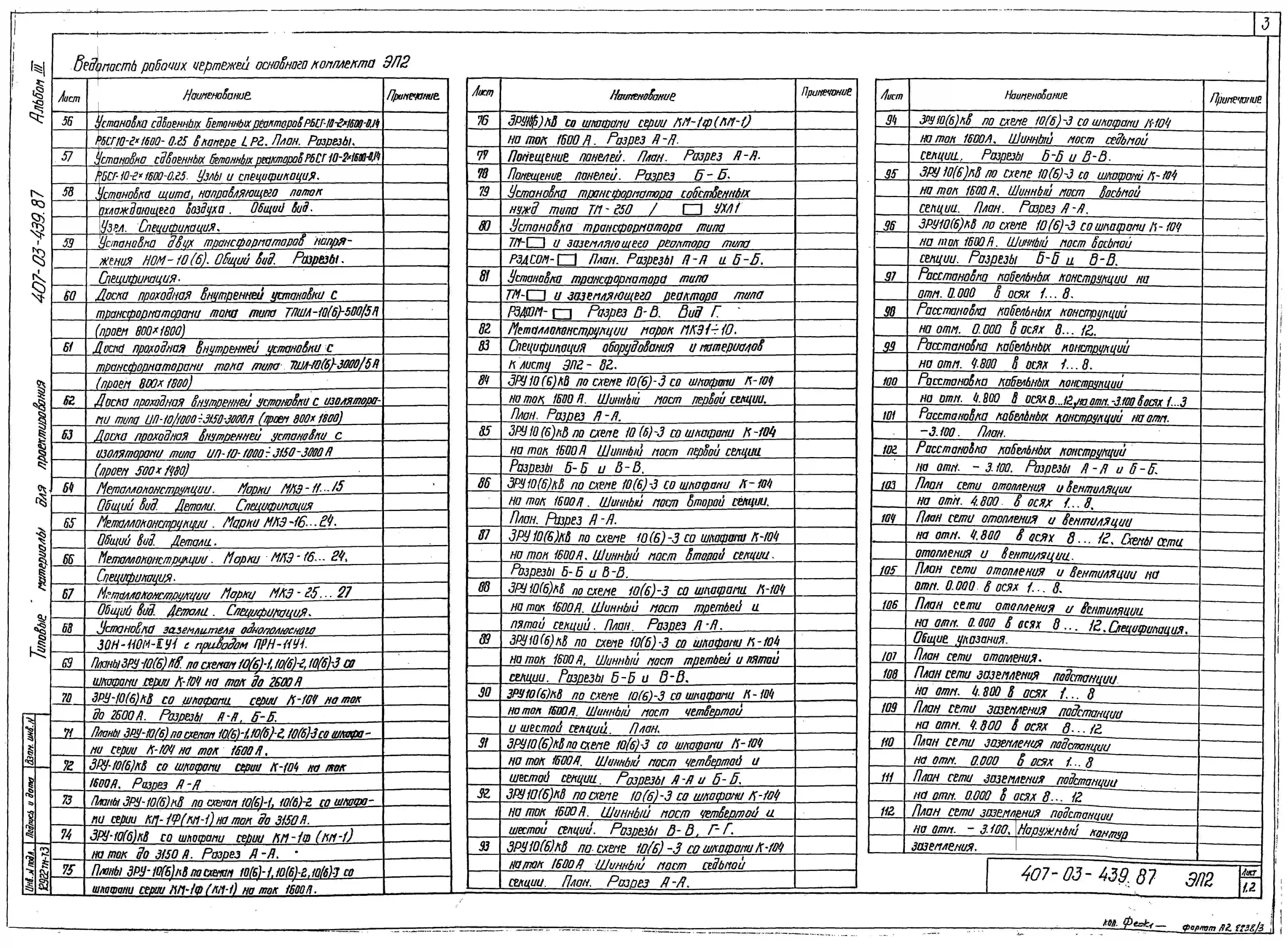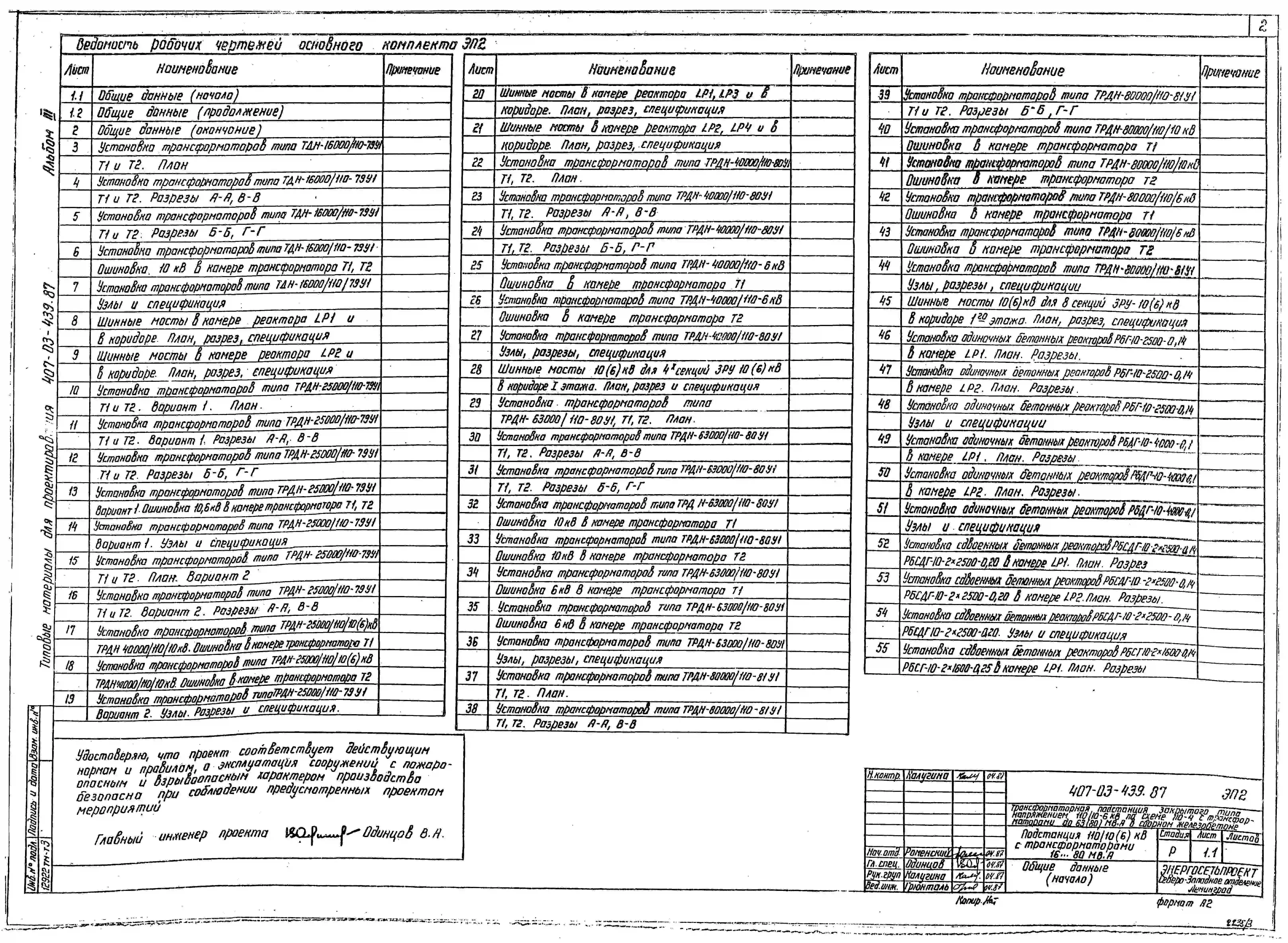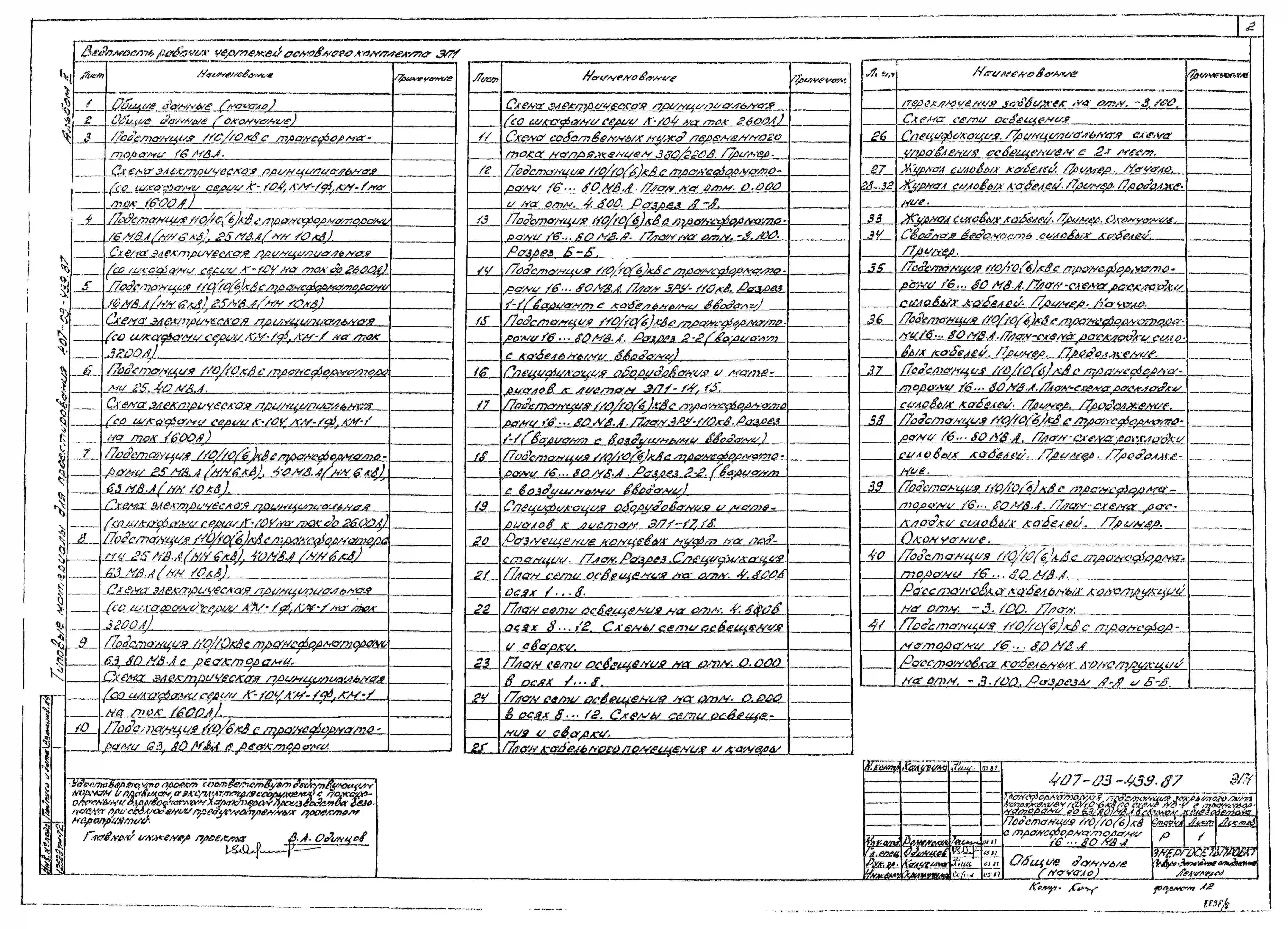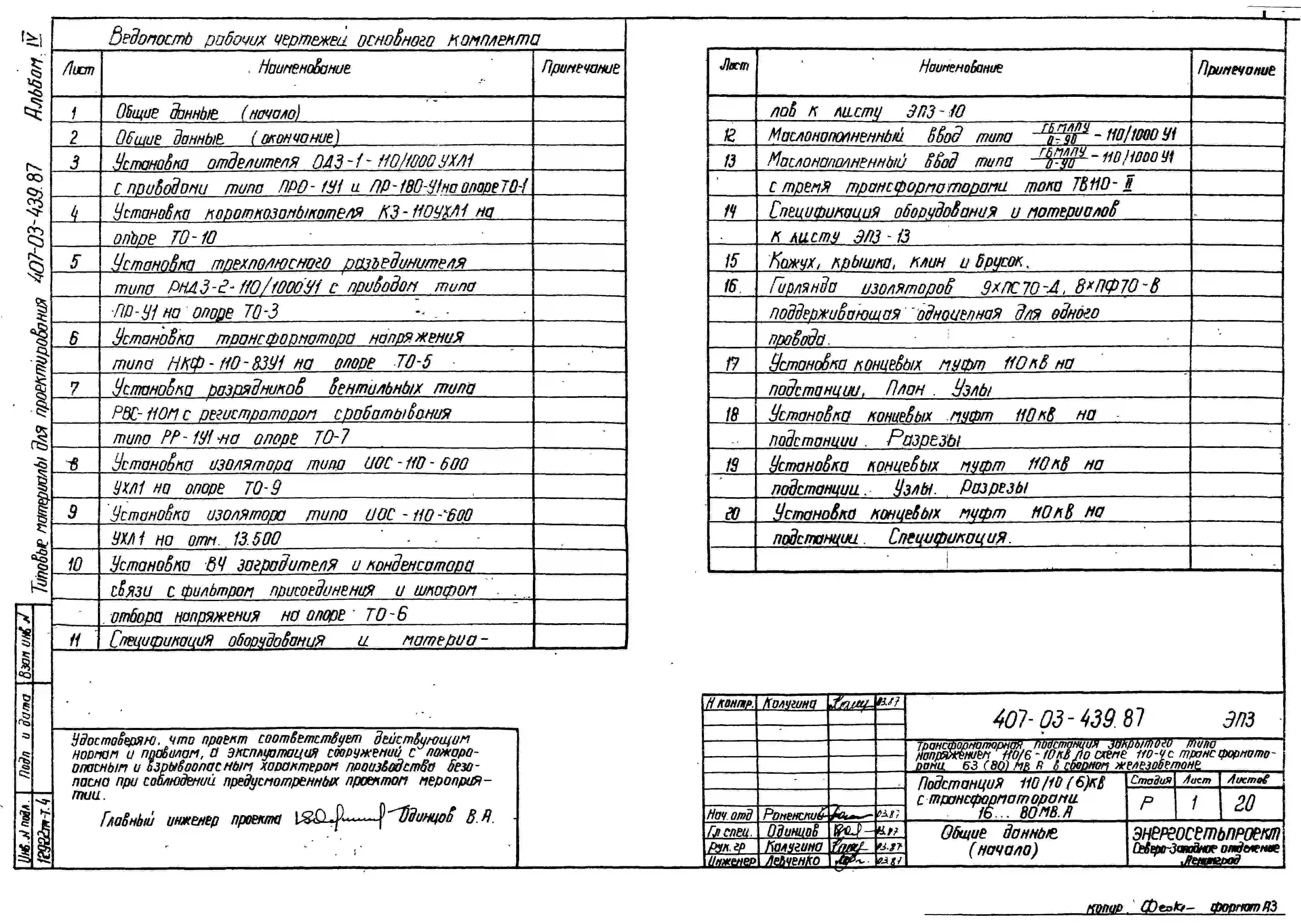 Типовой проект 407-03-439.87 МП Трансформаторная подстанция закрытого типа напряжением 110/6-10 кВ по схеме 110-4 с трансформаторами до 63(80) МВ.А в сборном железобетоне