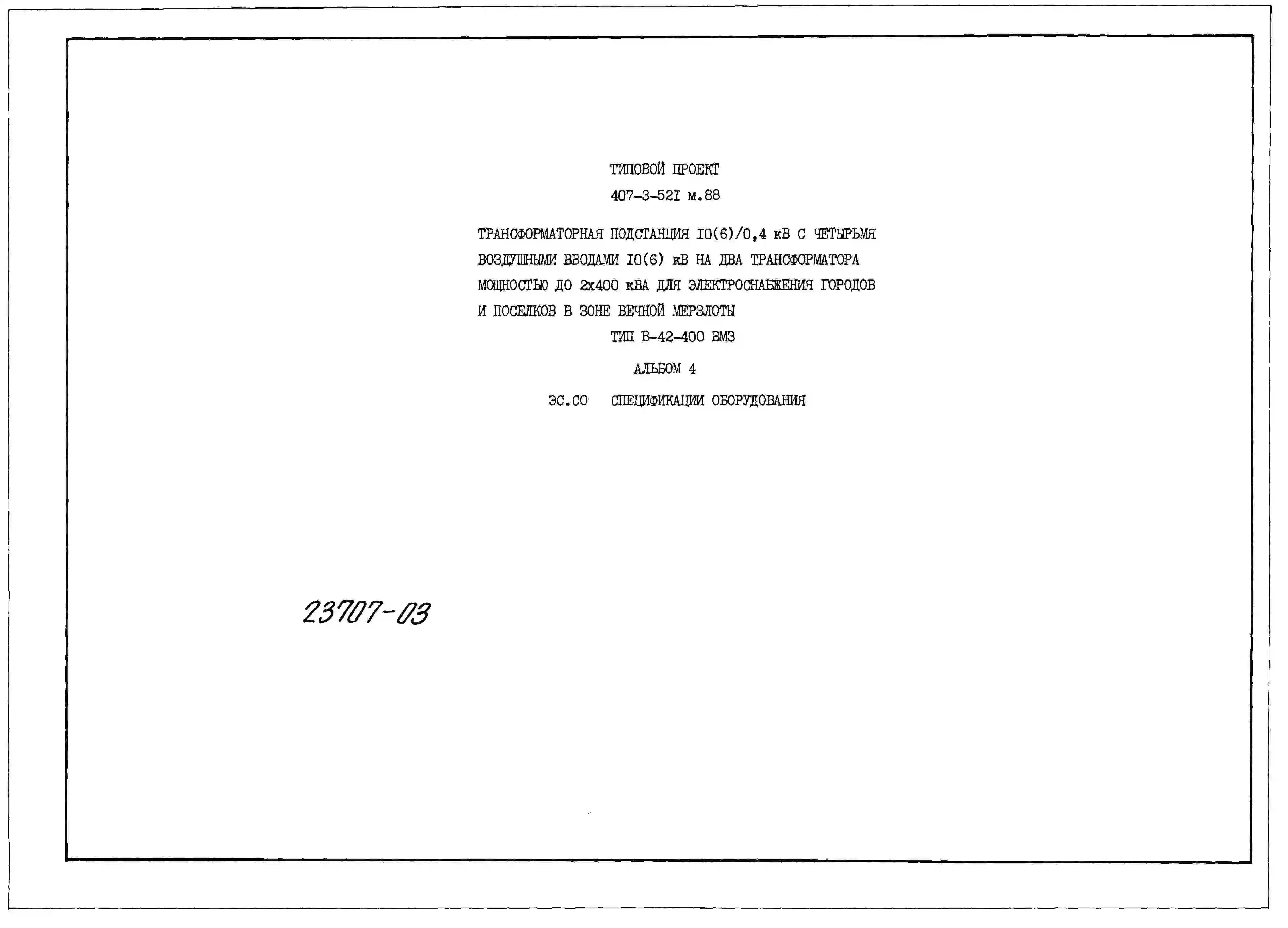 Типовой проект 407-3-525см.88 Трансформаторная подстанция 10(6)/0,4 кВ с четырьмя воздушными вводами 10(6) кВ на два трансформатора мощностью до 2x400 кВ?А для электроснабжения городов и поселков в зоне вечной мерзлоты и сейсмичности 7, 8, 9 баллов