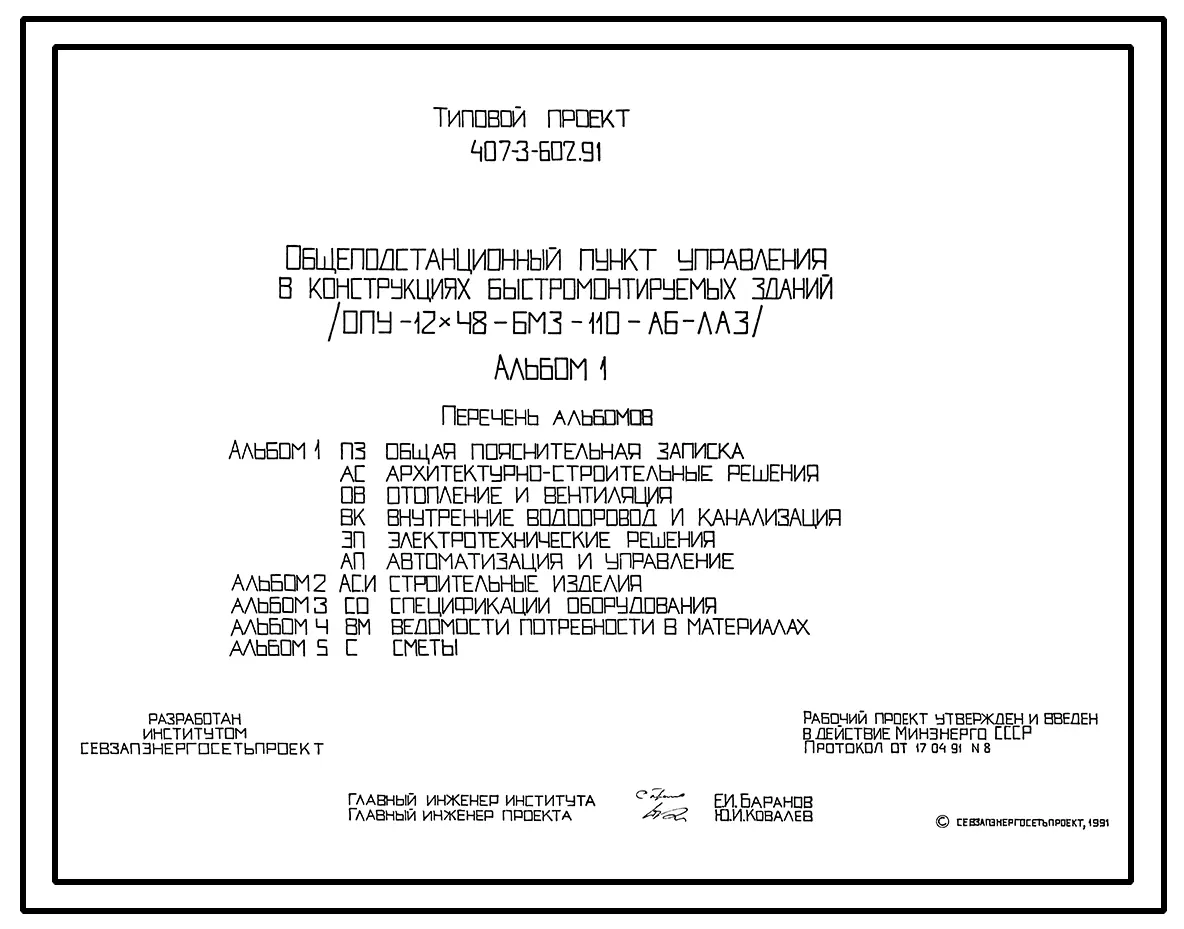 Типовой проект 407-3-602.91 Общеподстанционный пункт управления в конструкциях быстромонтируемых зданий (ОПУ-12х48-БМЗ-110-АБ-ЛАЗ)