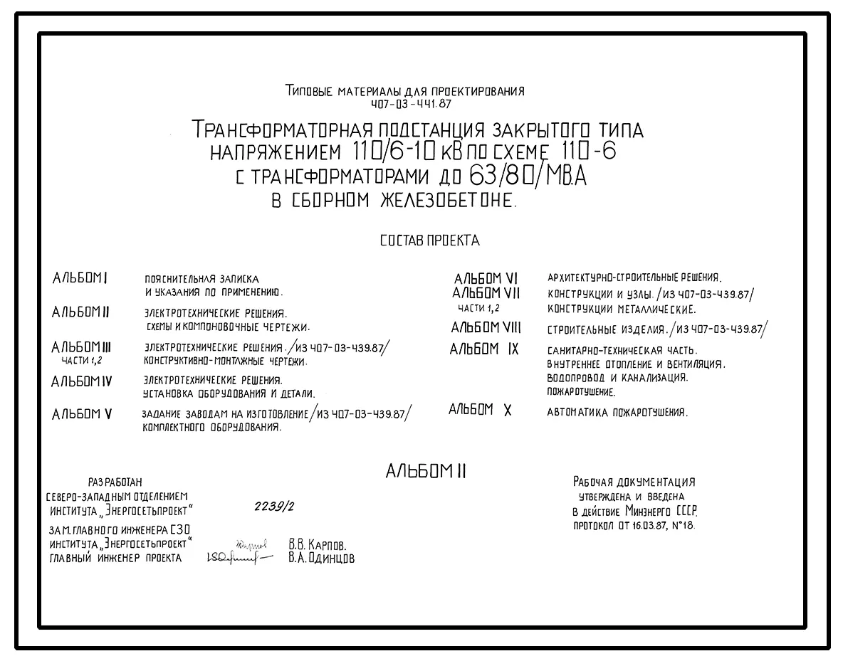 Типовой проект 407-03-441.87 ТРАНСФОРМАТОРНАЯ ПОДСТАНЦИЯ ЗАКРЫТОГО ТИПА НАПРЯЖЕНИЕМ 110/6-10 кВ ПО СХЕМЕ 110-6 С ТРАНСФОРМАТОРАМИ ДО 63(80) MBA В СБОРНОМ ЖЕЛЕЗОБЕТОНЕ