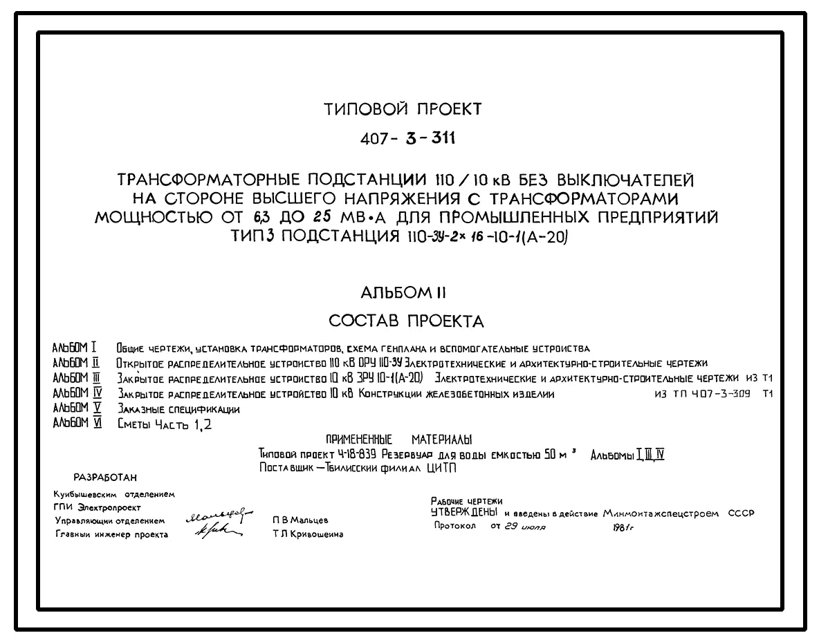 Типовой проект 407-3-311 Трансформаторные подстанции 110/10 кВ без выключателей на стороне высшего напряжения с трансформаторами мощностью от 6,3 до 25 МВА для промышленных предприятий. Тип III подстанция 110-3(V)-2х16-10-1(А-20).