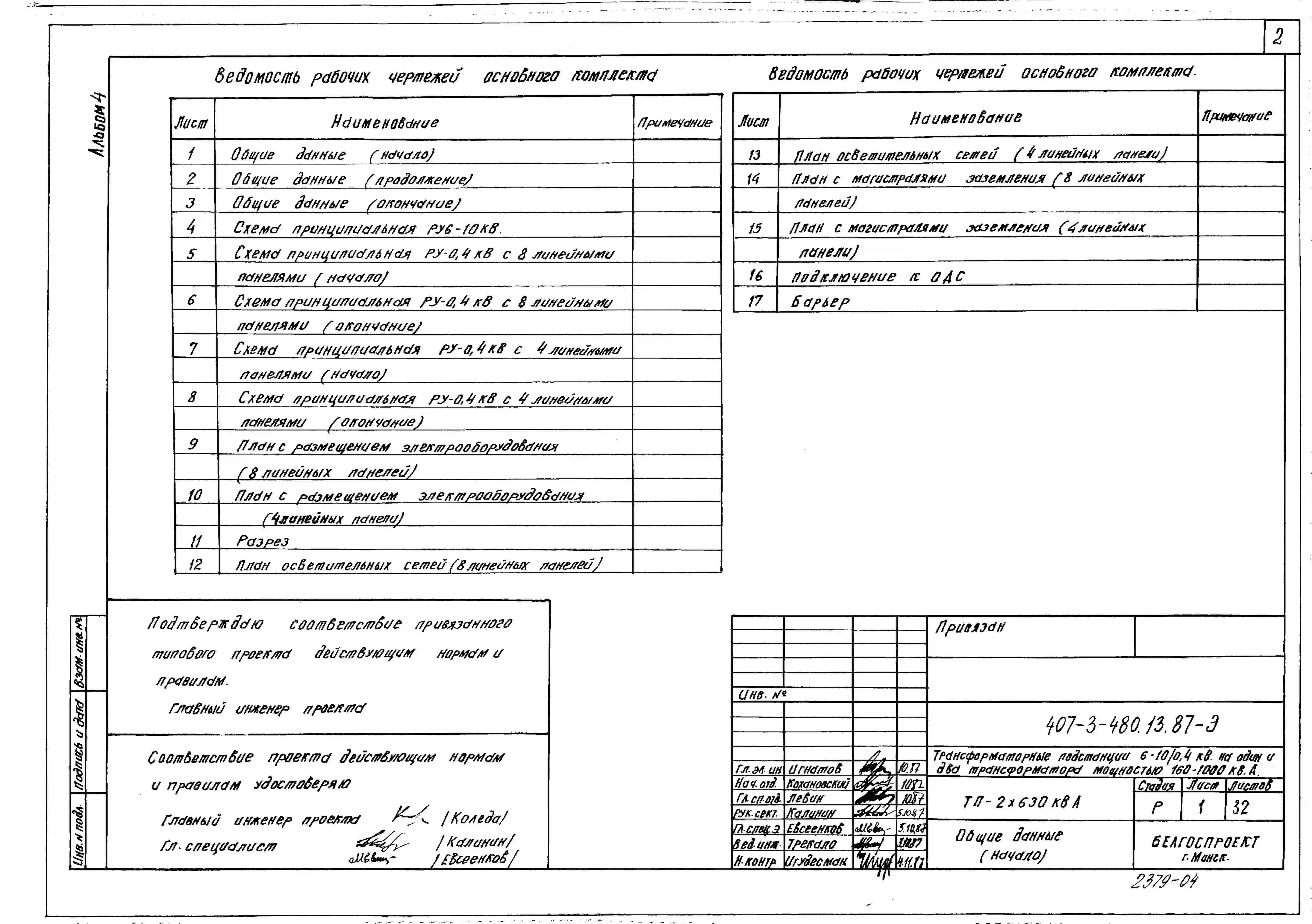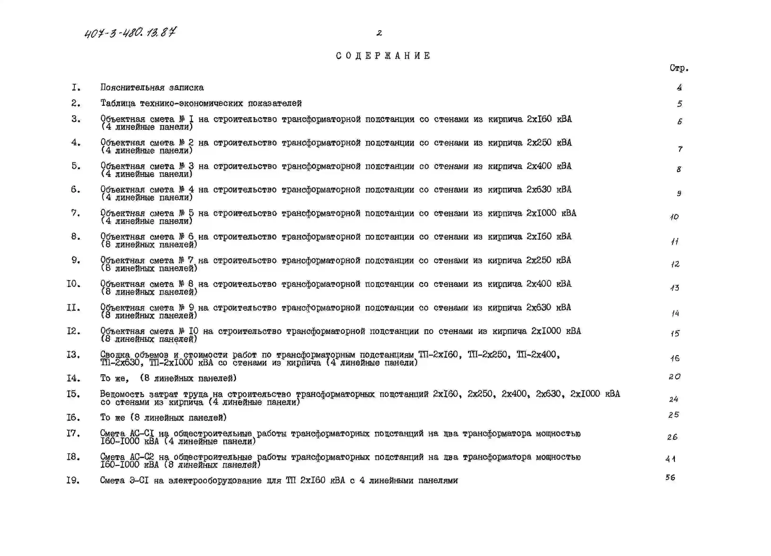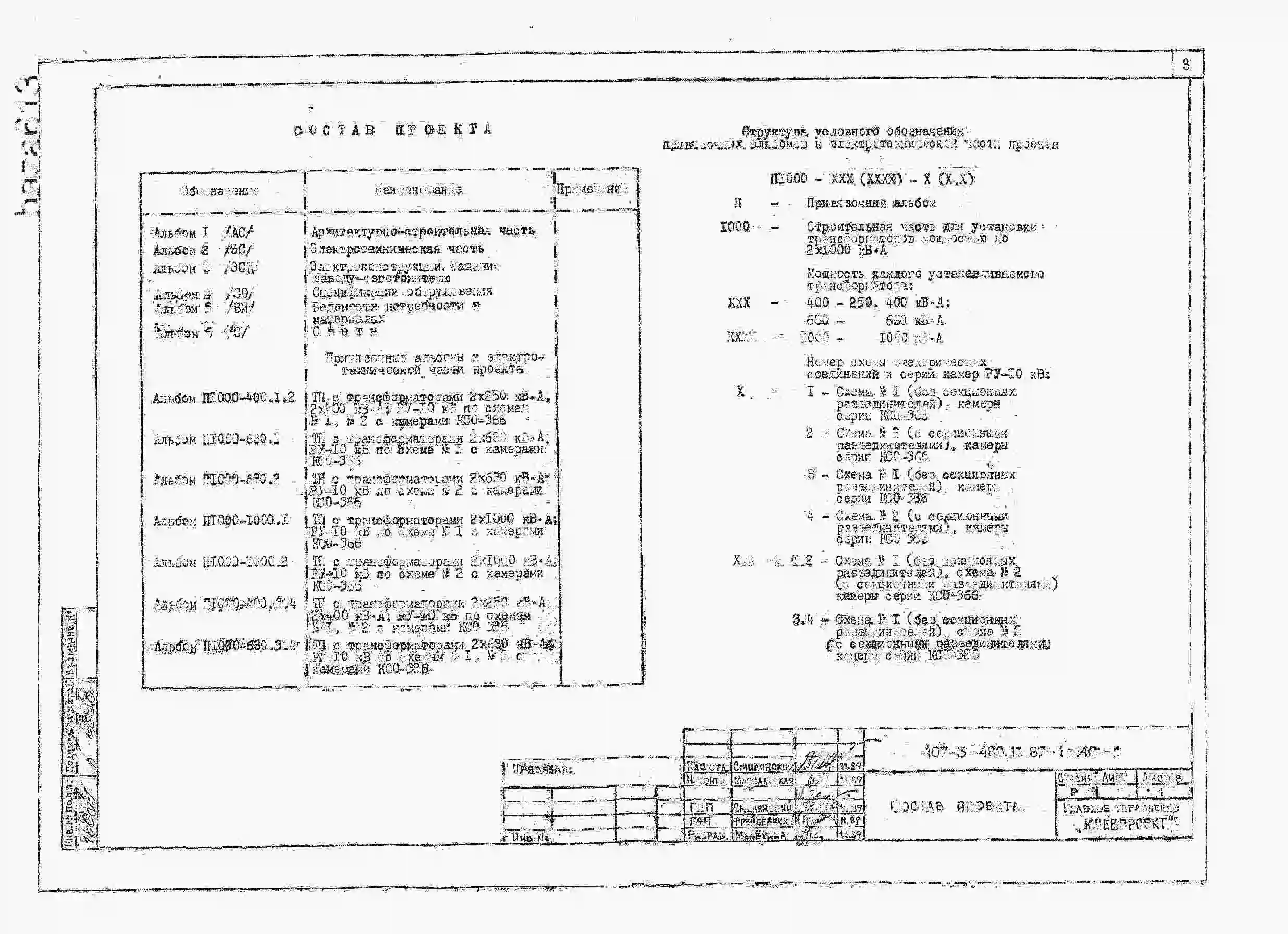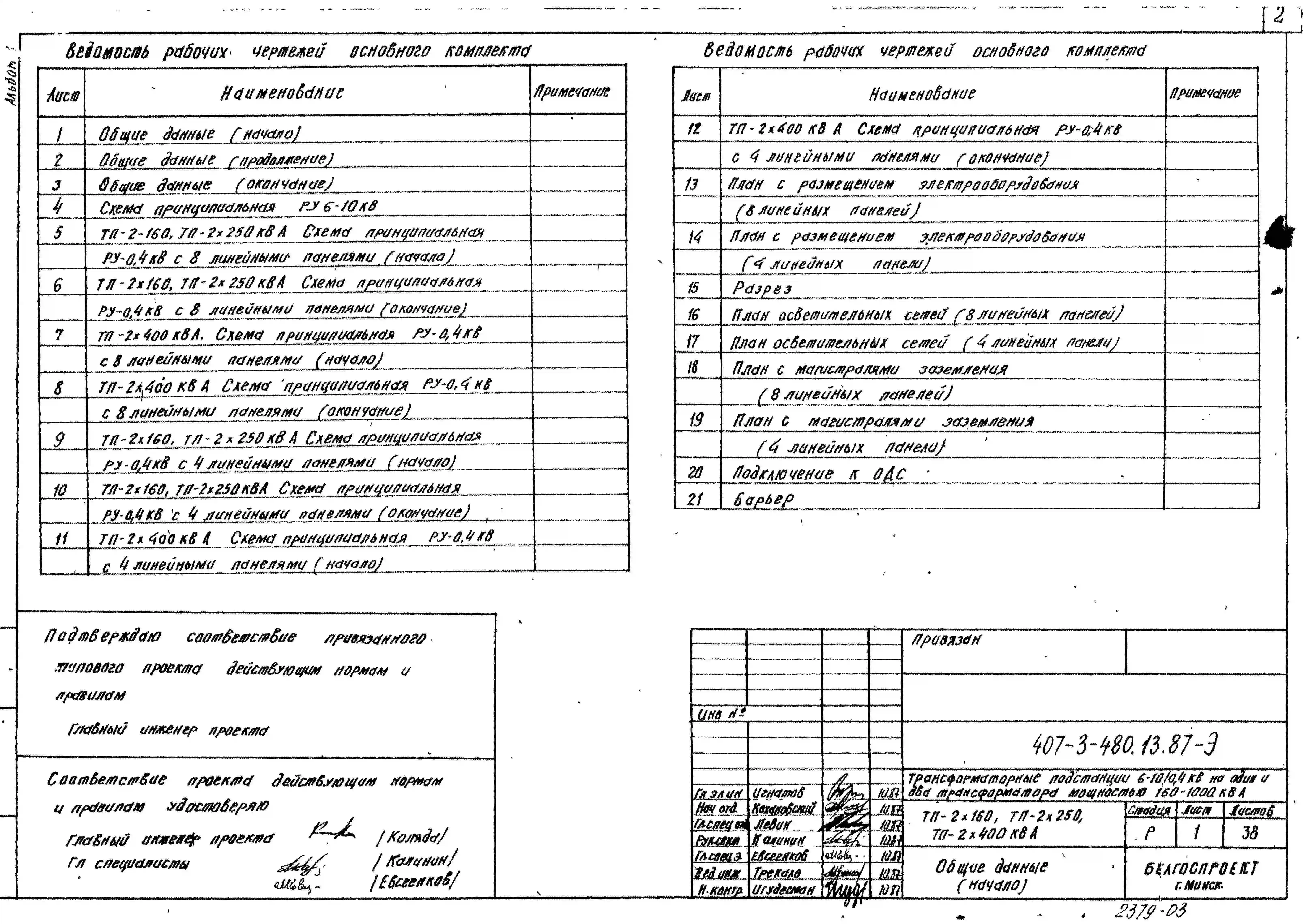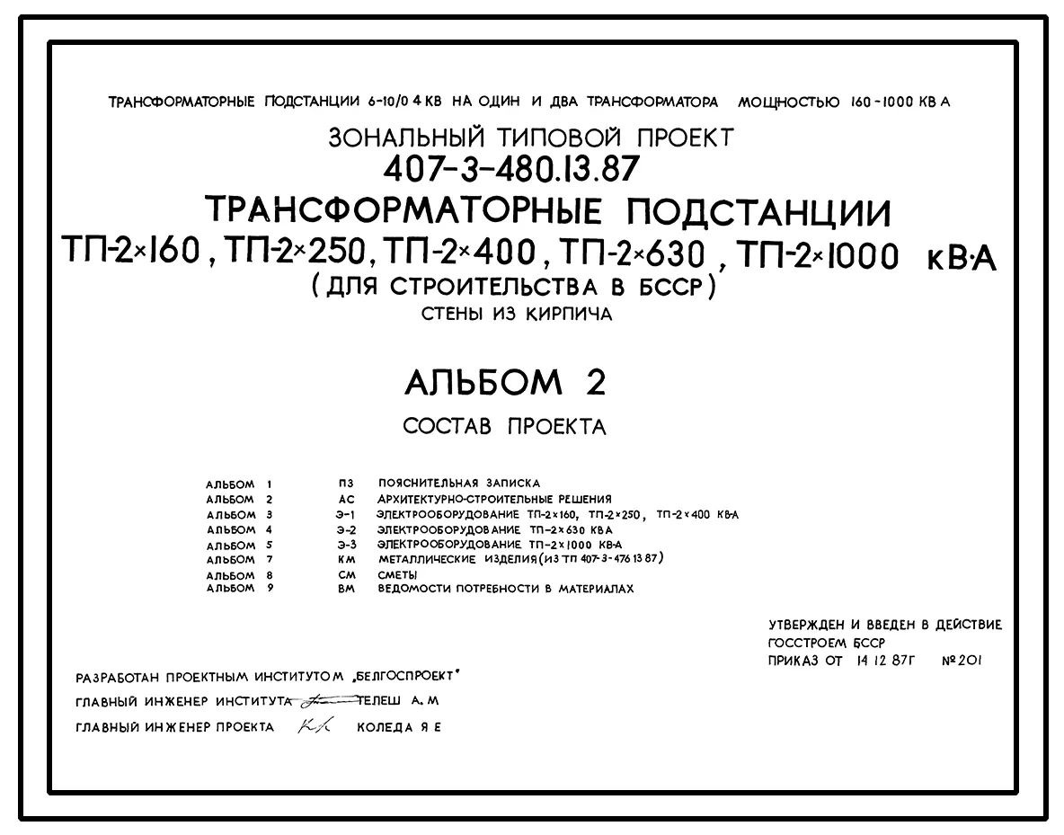 Типовой проект 407-3-480.13.87 Трансформаторные подстанции ТП-2х160, ТП-2х250, ТП-2х400, ТП-2х630, ТП-2х1000 кВА. Стены из кирпича. Для Белорусской ССР