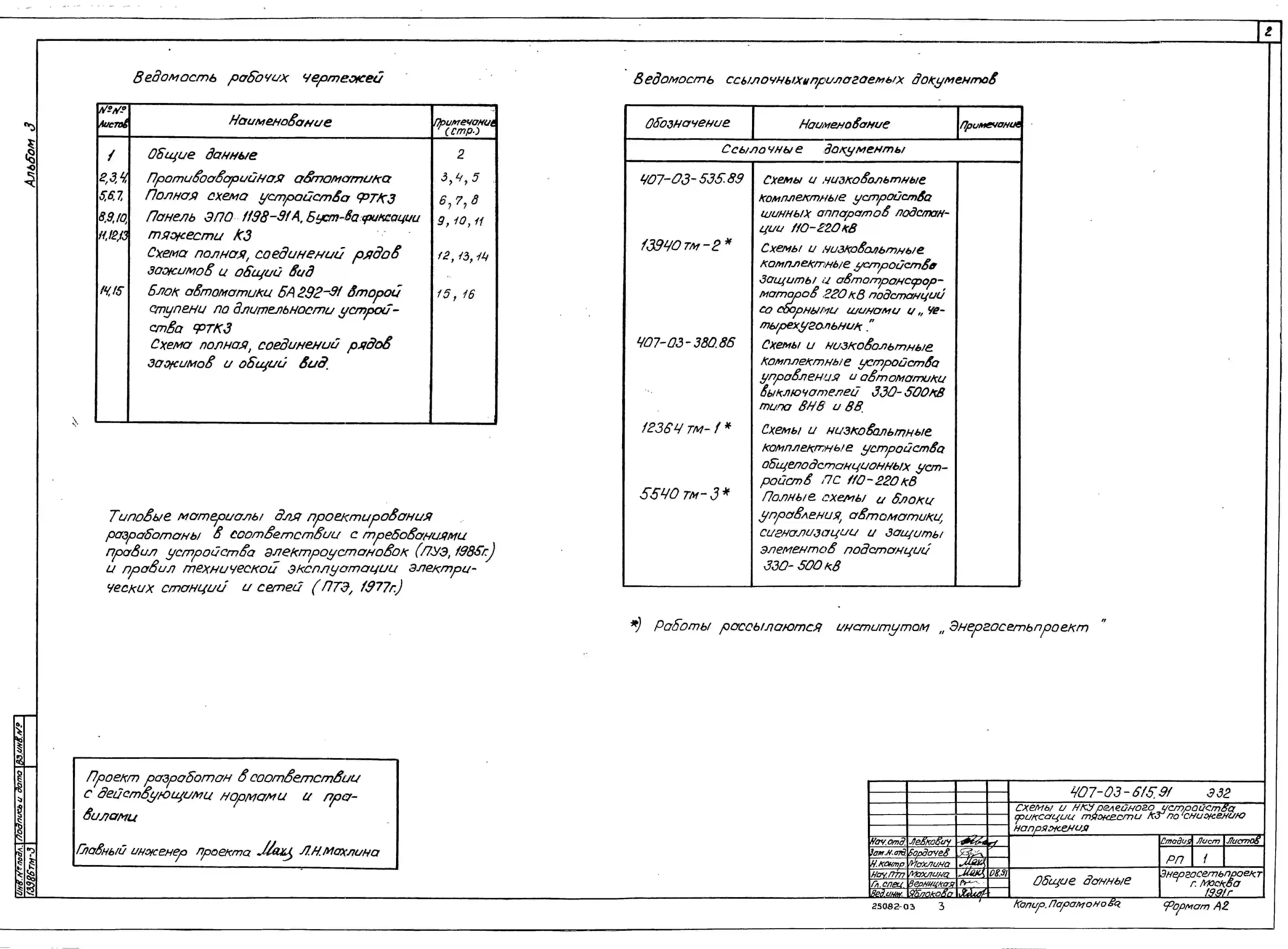 Типовой проект 407-03-615.91 Схемы и низковольтные комплектные устройства релейного устройства фиксации тяжести короткого замыкания по снижению напряжения