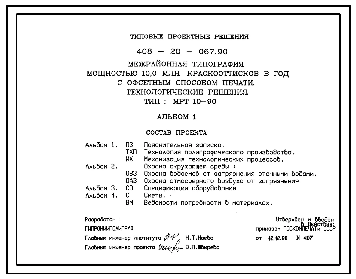 Типовой проект 408-20-067.90 Межрайонная типография мощностью 10 млн. краскооттисков в год с офсетным способом печати. Технологические решения. Тип МРТ 10-90