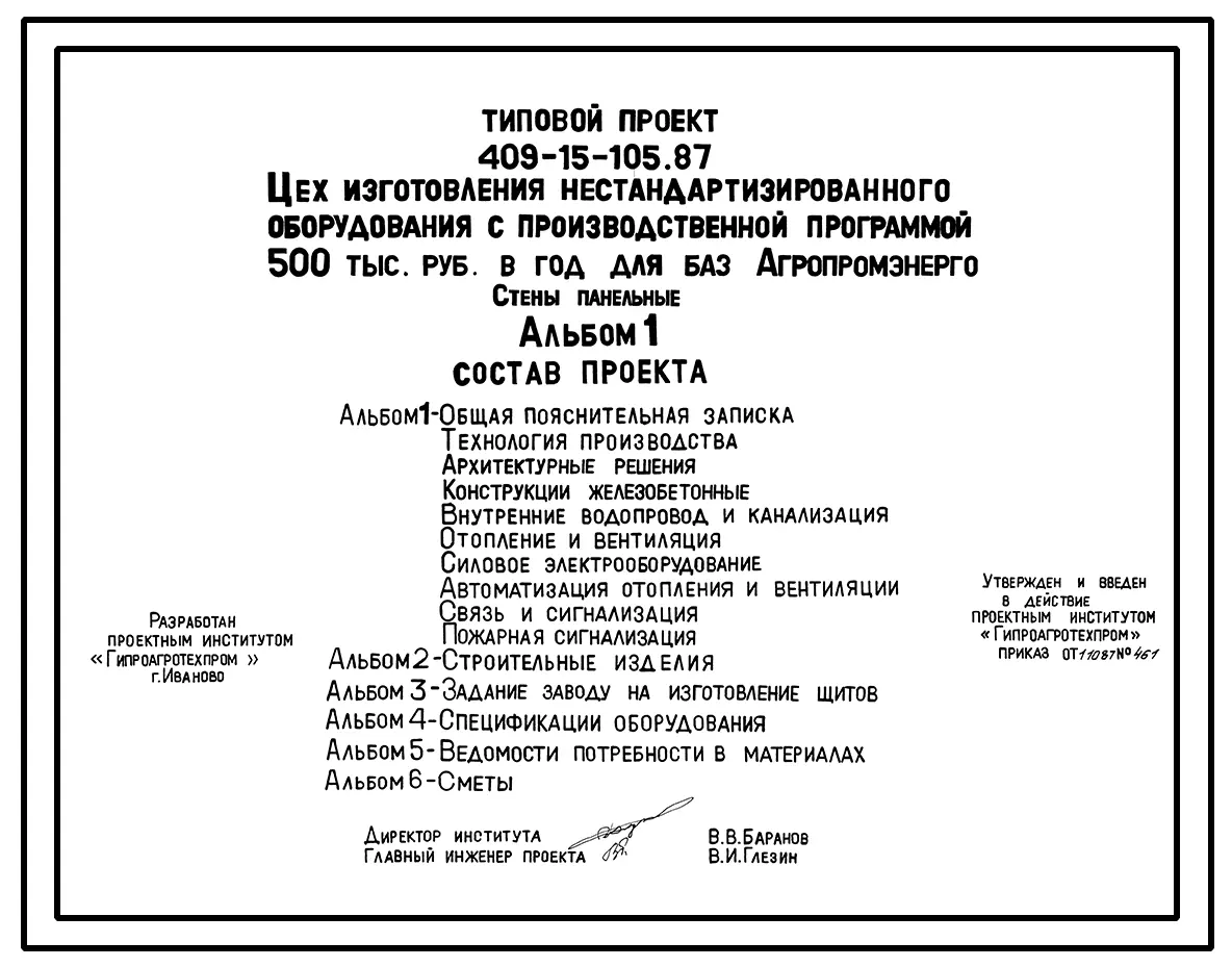 Типовой проект 409-15-105.87 Цех изготовления нестандартизированного оборудования с производственной программой 500 тыс. руб. в год для баз «Агропромэнерго». Предназначен для изготовления нестандартизированного оборудования