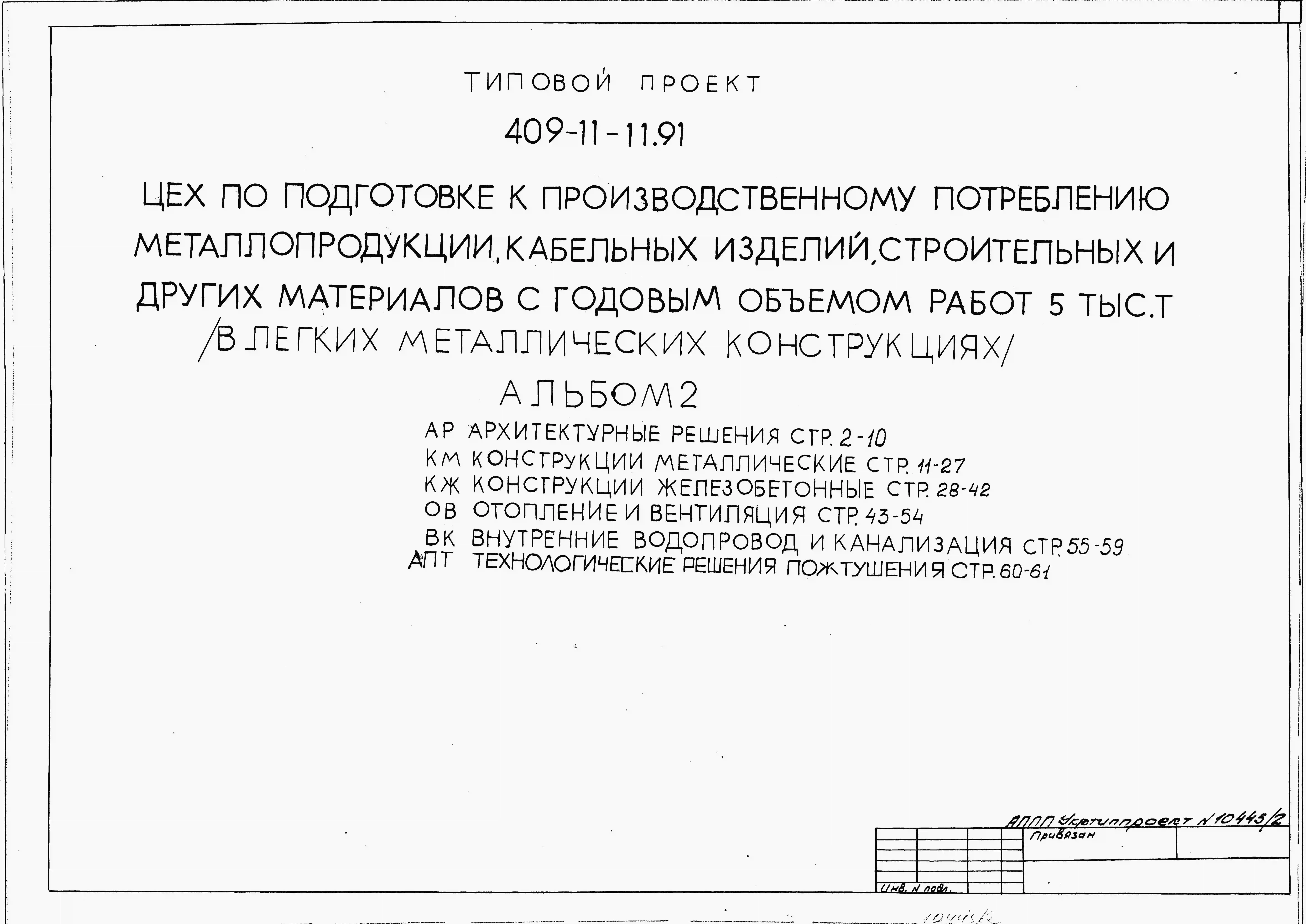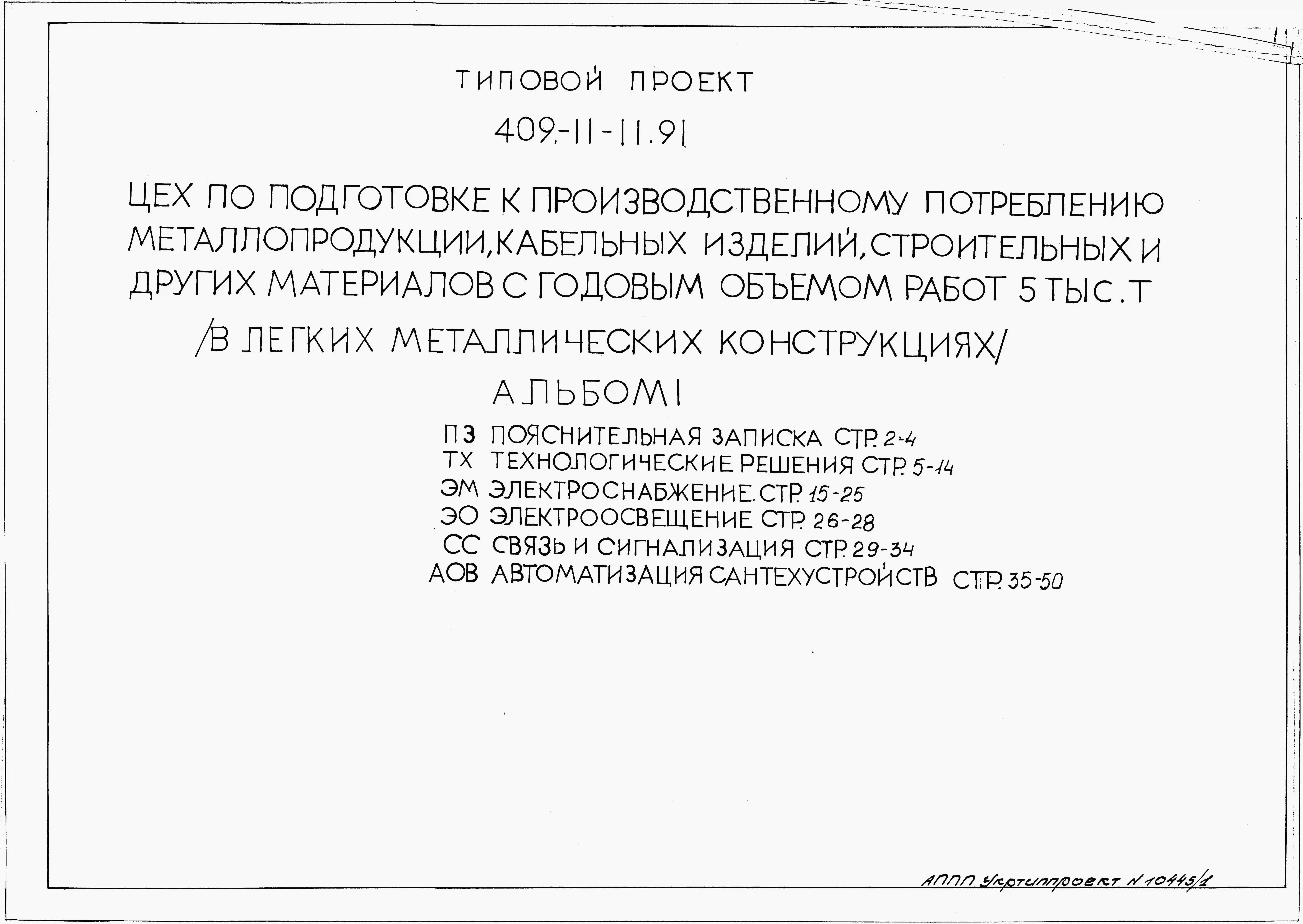 Типовой проект 409-11-11.91 Цех по подготовке к производственному потреблению металлопродукции, кабельных изделий, строительных и других материалов с годовым объемом работ 5 тыс.т (в легких металлических конструкциях).