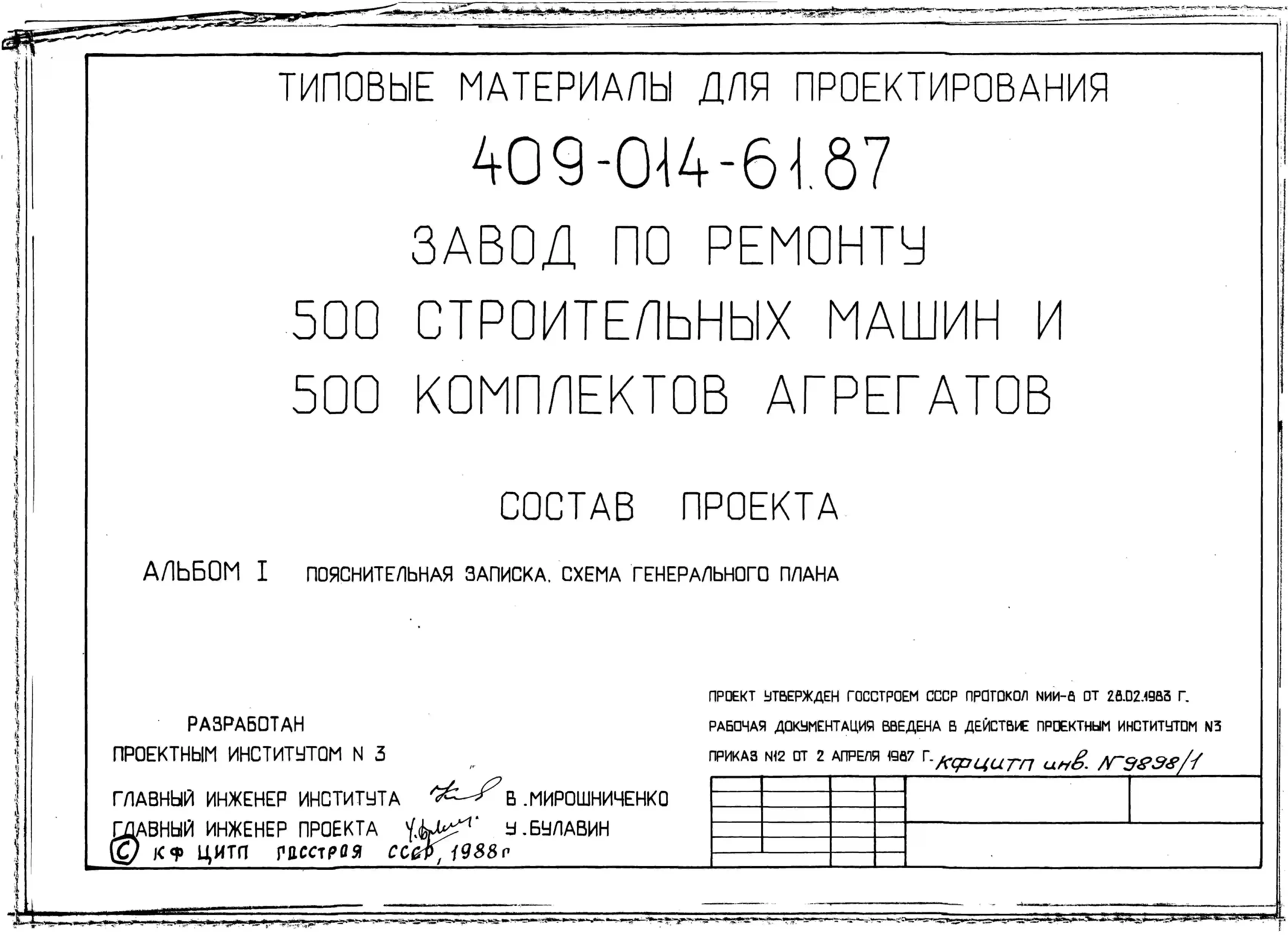 ТИповой проект 409-014-61.87 Завод по ремонту 500 строительных машин и 500 комплектов агрегатов