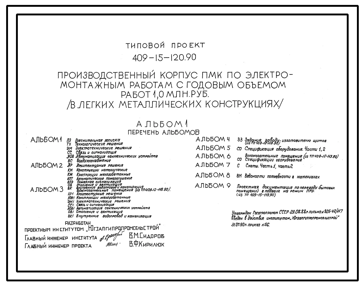 Типовой проект 409-15-120.90 Производственный корпус ПМК по электромонтажным работам с годовым объемом работ 1,0 млн.руб. (в легких металлических конструкциях)