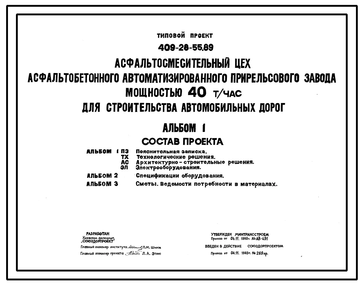 Типовой проект 409-28-55.89 Асфальтосмесительный цех асфальтобетонного автоматизированного прирельсового завода мощностью 40 т в час для строительства автомобильных дорог
