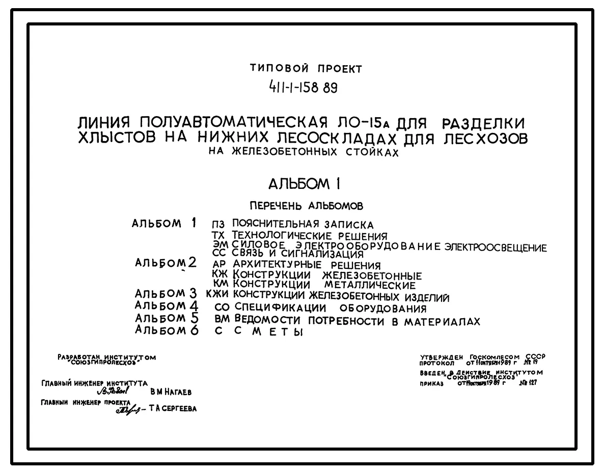 Типовой проект 411-1-158.89 Линия полуавтоматическая ЛО-15 А для разделки хлыстов на нижних лесоскладах для лесхозов (на железобетонных стойках)
