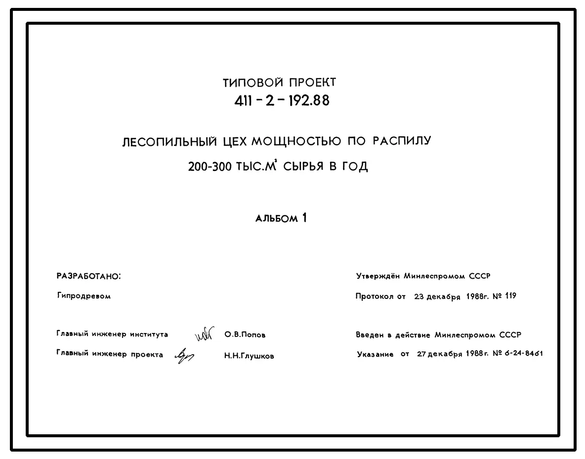 Типовой проект 411-2-192.88 Лесопильный цех мощностью по распилу 200-300 тыс.м.куб сырья в год.