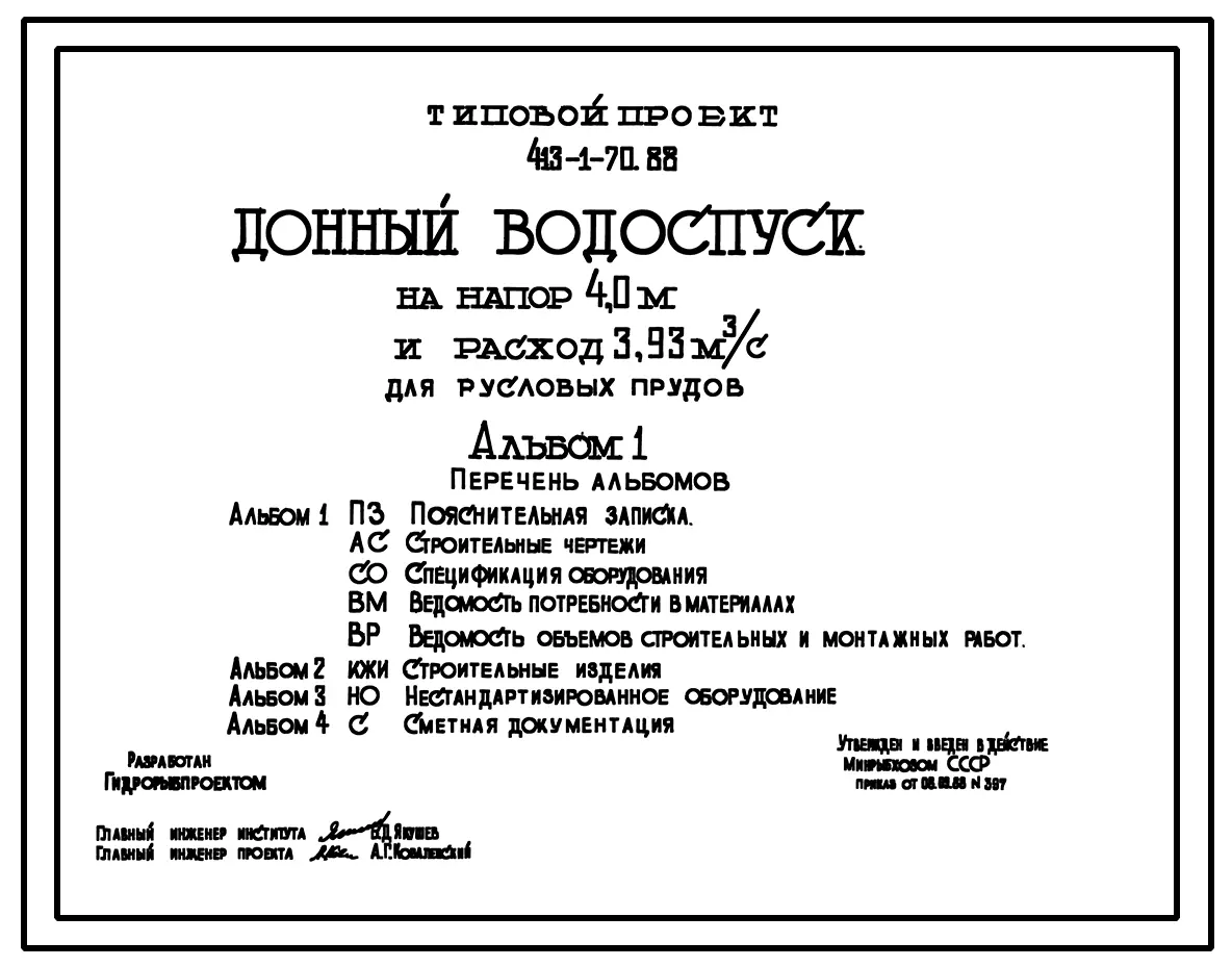 Типовой проект 413-1-70.88 Донный водоспуск на напор 4,0 м и расход 3,93 м.куб/с для русловых прудов.
