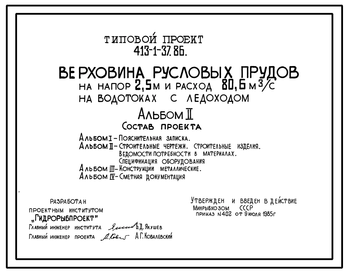 Типовой проект 413-1-37.86 Верховина русловых прудов на напор 2,5 м и расход 80,6 м3/с на водотоках без ледохода