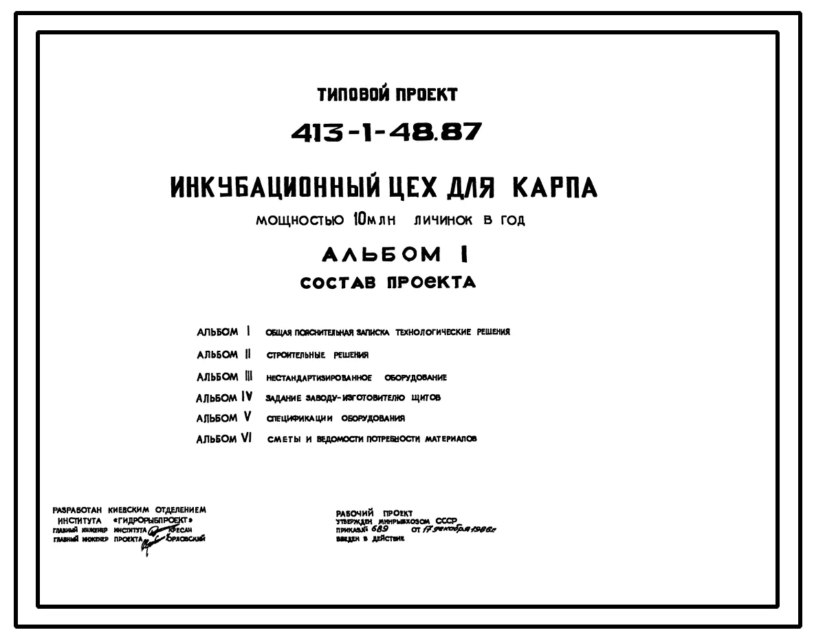 Типовой проект 413-1-48.87 Инкубационный цех для карпа мощностью 10 млн. личинок в год