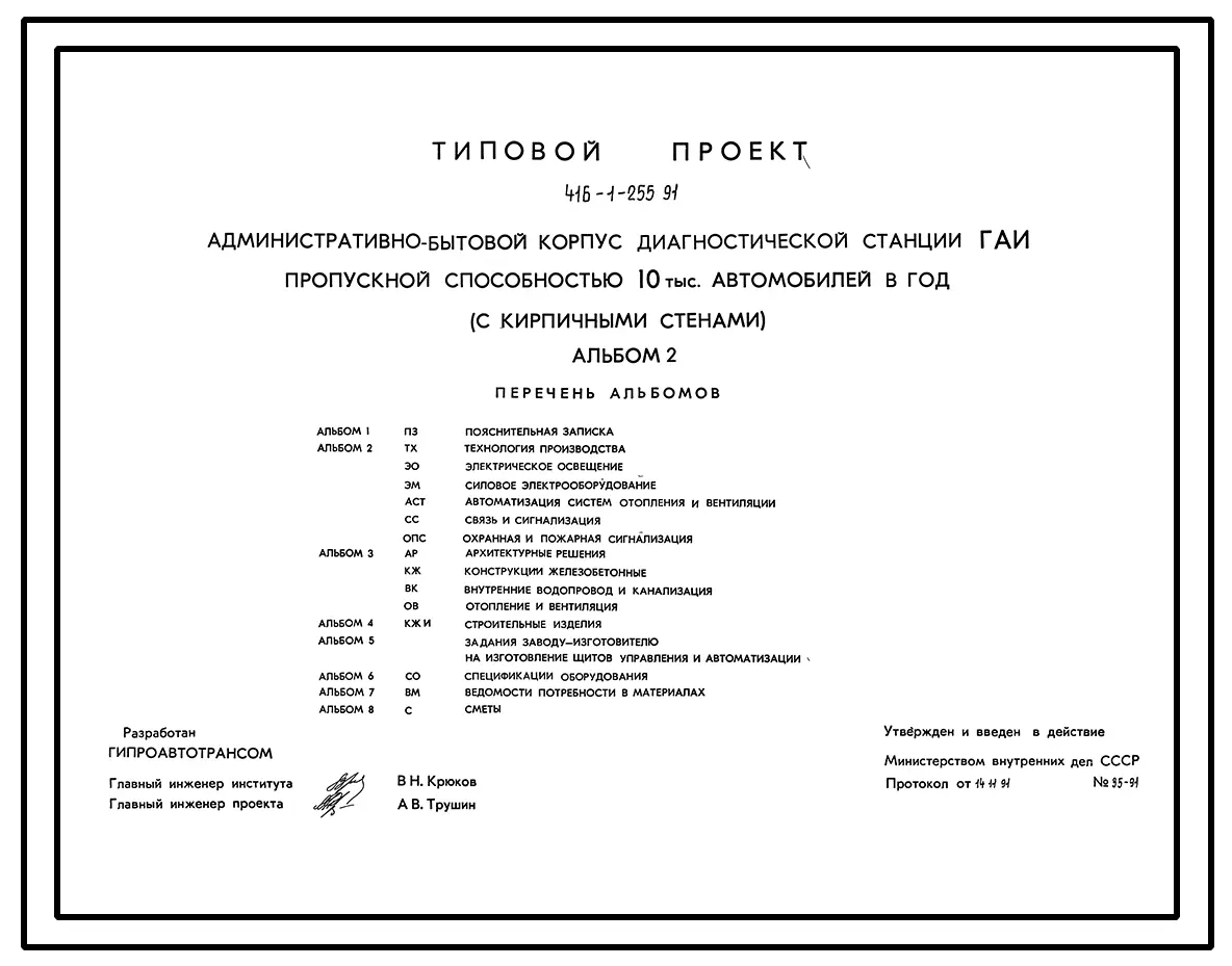Типовой проект 416-1-255.91 Административно-бытовой корпус диагностической станции ГАИ пропускной способностью 10 тыс. автомобилей в год (с кирпичными стенами)