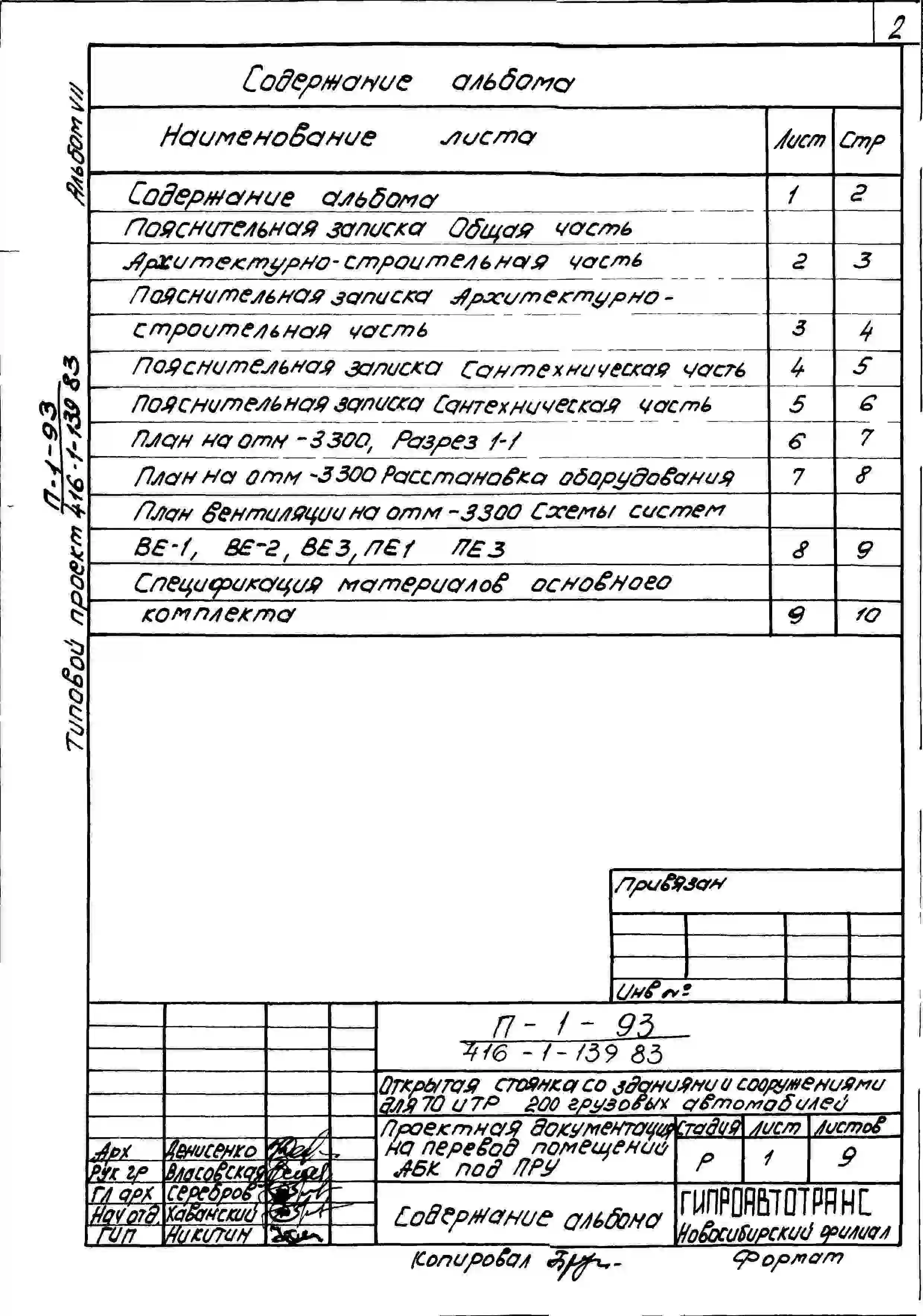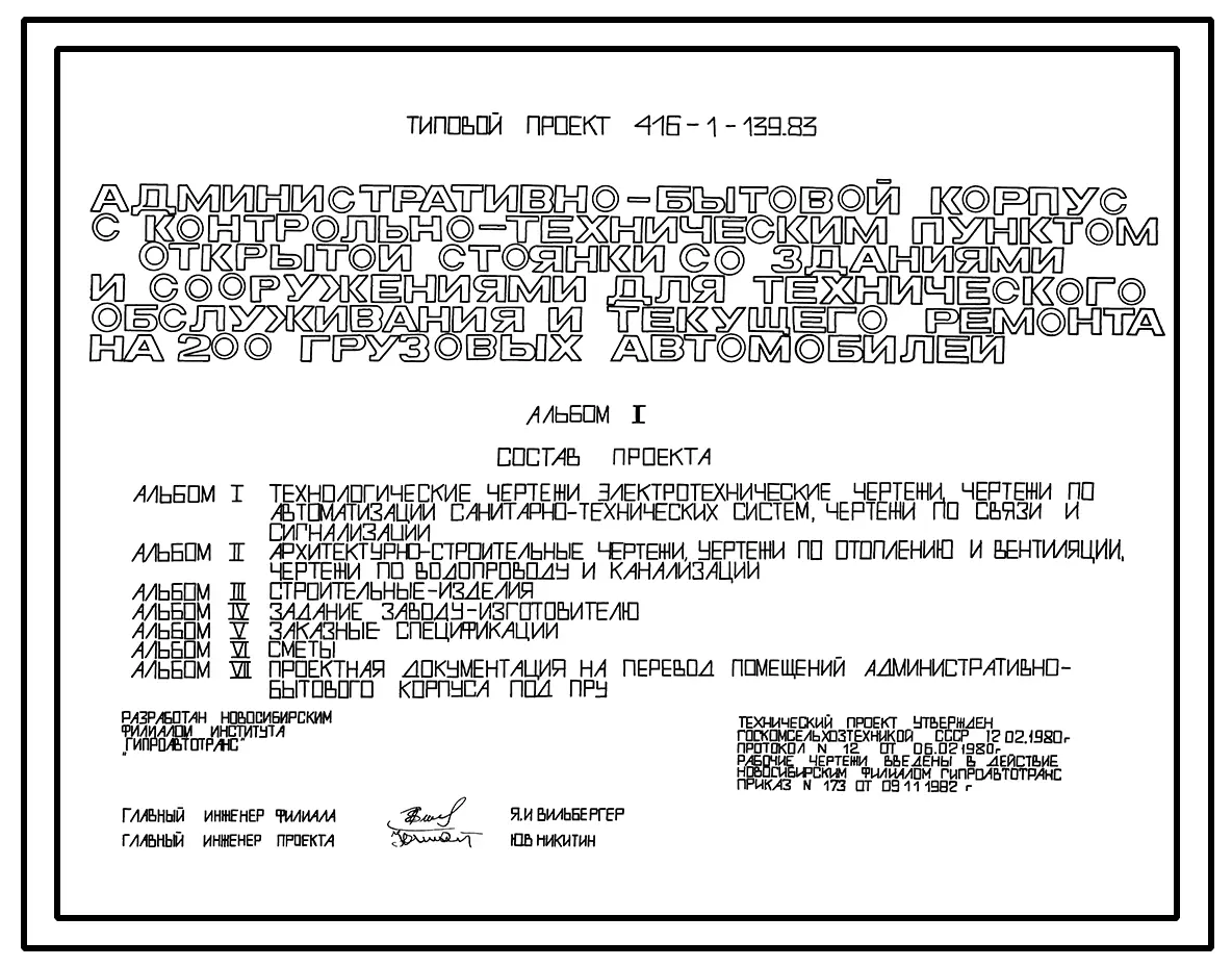 Типовой проект 416-1-139.83 Административно-бытовой корпус с контрольно-техническим пунктом открытой стоянки созданиями и сооружениями для технического обслуживания и текущего ремонта на 200 грузовых автомобилей