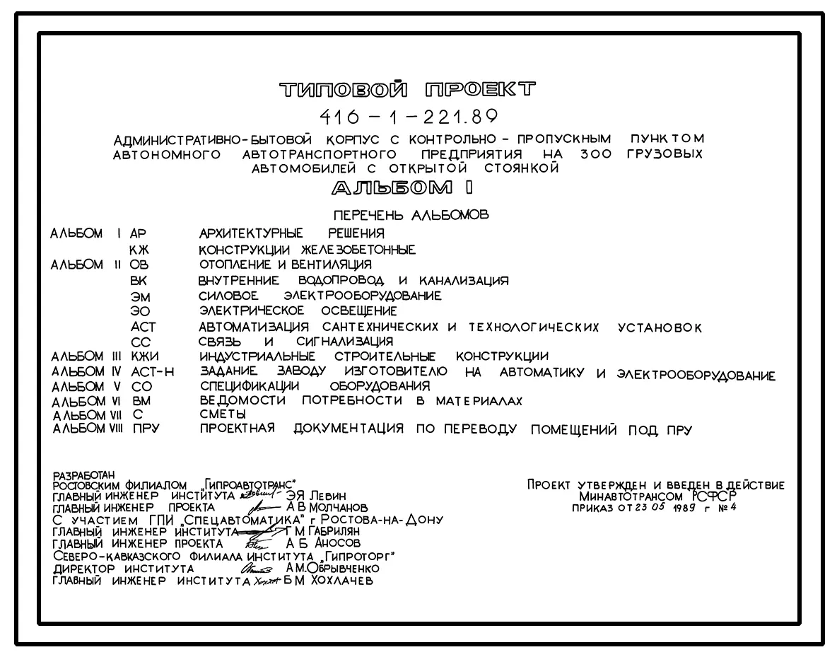 Типовой проект 416-1-221.89 Административно-бытовой корпус с контрольно-пропускным пунктом автотранспортного предприятия на 300 грузовых автомобилей с открытой стоянкой