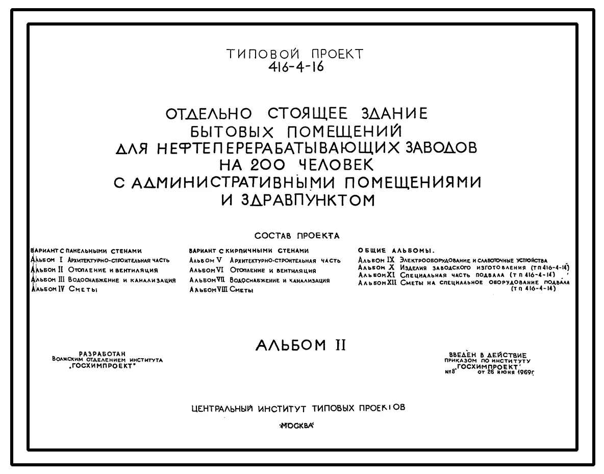 Типовой проект 416-4-16 Отдельностоящее здание бытовых помещений для нефтеперерабатывающих заводов на 200 человек с административными помещениями и здравпунктом.