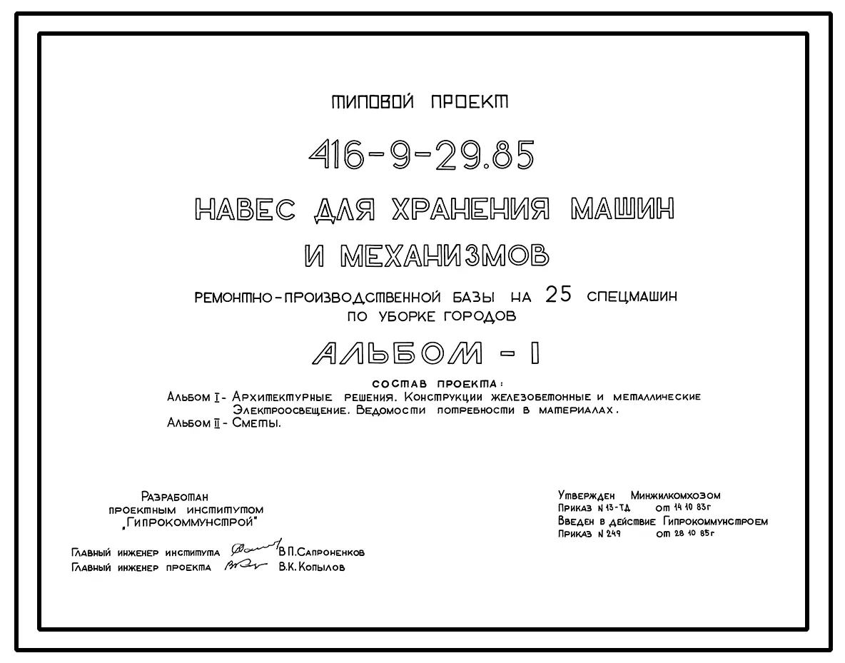 Типовой проект 416-9-29.85 Навес для хранения машин и механизмов ремонтно-производственной базы на 25 спецмашин по уборке городов
