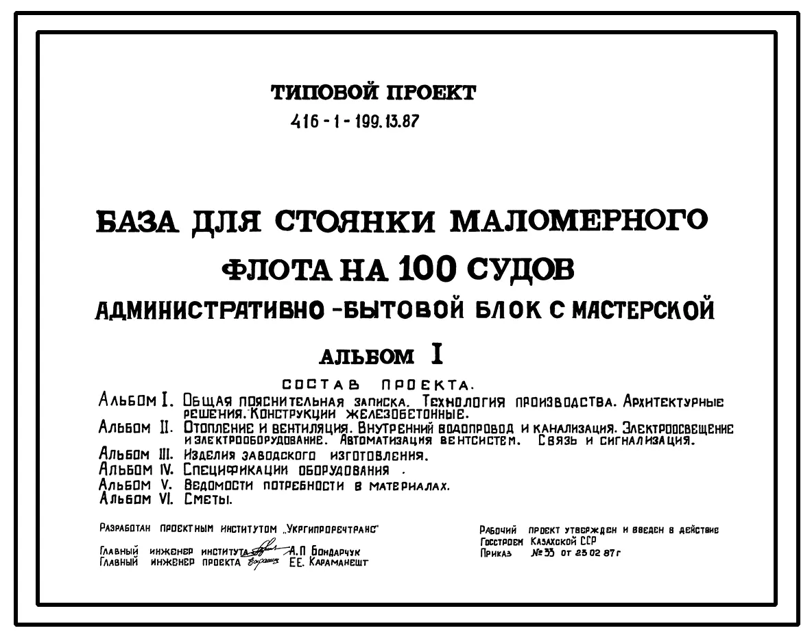 Типовой проект 416-1-199.13.87 Административно-бытовой блок с мастерской базы для стоянки маломерного флота на 100 судов. Для Казахской ССР