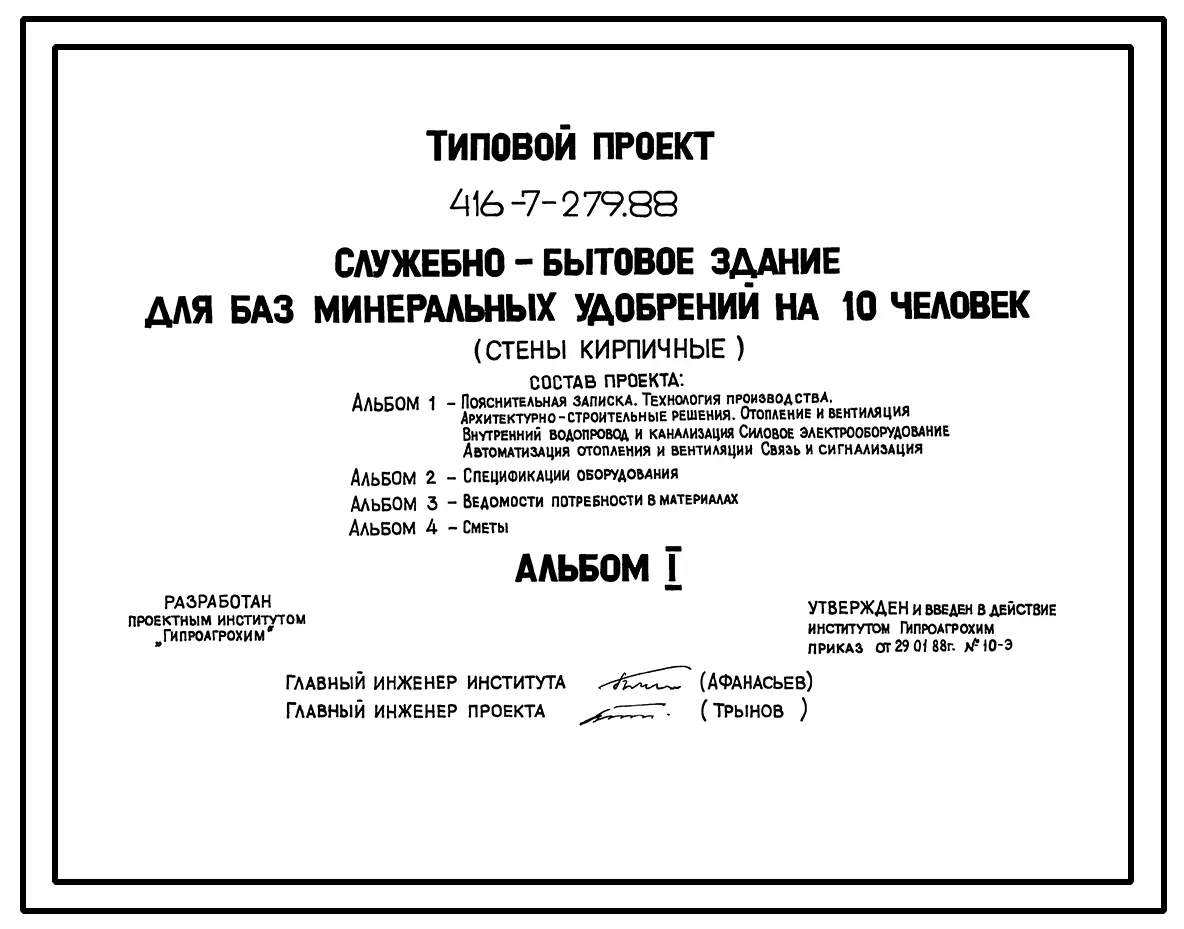 Типовой проект 416-7-279.88 Служебно-бытовое здание для баз минеральных удобрений на 10 чел. Размеры здания - 12x21 м. Расчетная температура: -20, -30, -40°С. Стены – кирпичные. Покрытие - железобетонные плиты по железобетонным балкам