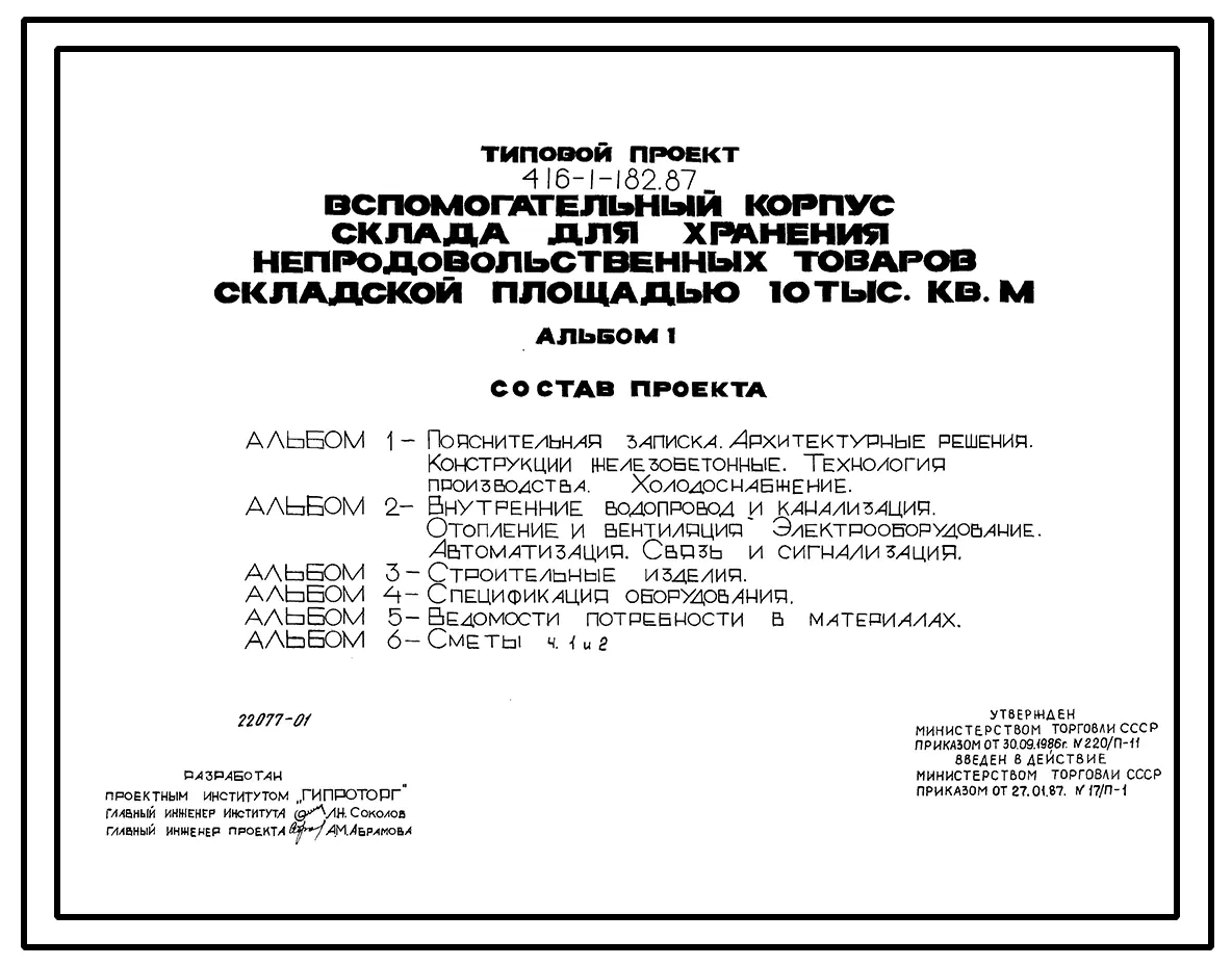 Типовой проект 416-1-182.87 Вспомогательный корпус склада для хранения непродовольственных товаров складской площадью 10 тыс. м2