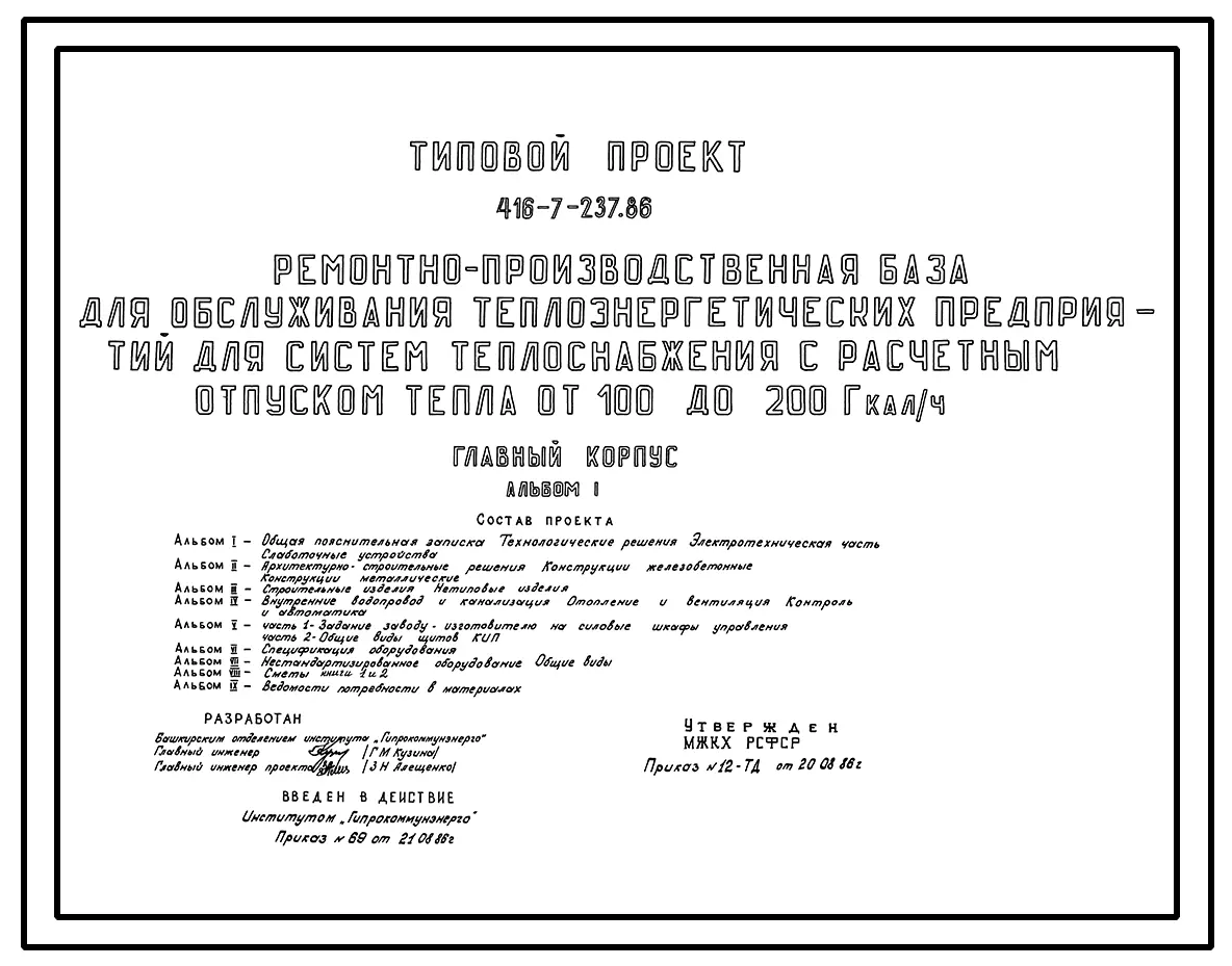 Типовой проект 416-7-237.86 Главный корпус ремонтно-производственной базы для обслуживания теплоэнергетических предприятий для систем теплоснабжения с расчетным отпуском тепла от 100 до 200 гкал/ч